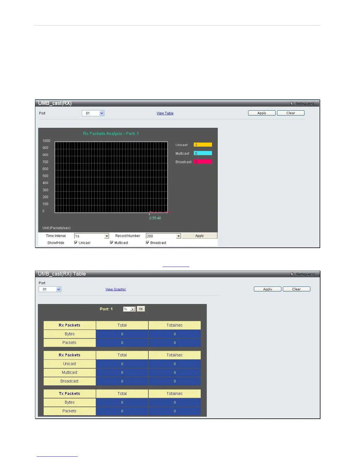 This table displays the UMB_cast RX Packets on the Switch. To select a port to view these statistics for, select the