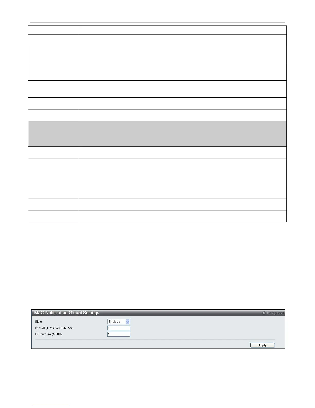 To configure the MAC Notification Global Settings for the Switch, click Configuration > MAC Notification Settings >