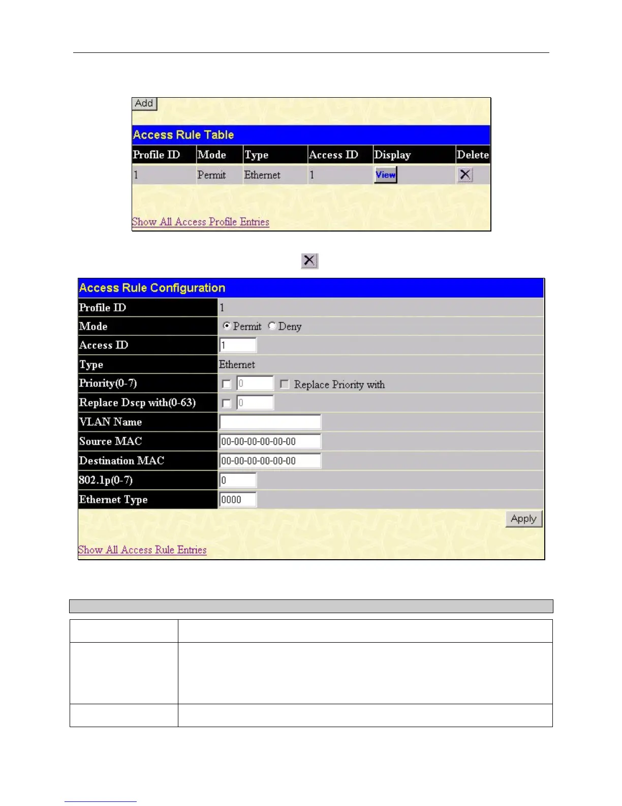 To configure the Access Rule for Ethernet, open the Access Profile Table and click Modify for an Ethernet entry. This