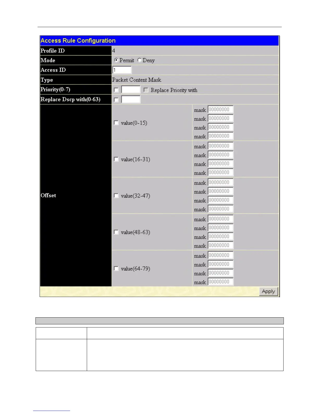 To set the Access Rule for the Packet Content Mask, adjust the following parameters and click Apply.