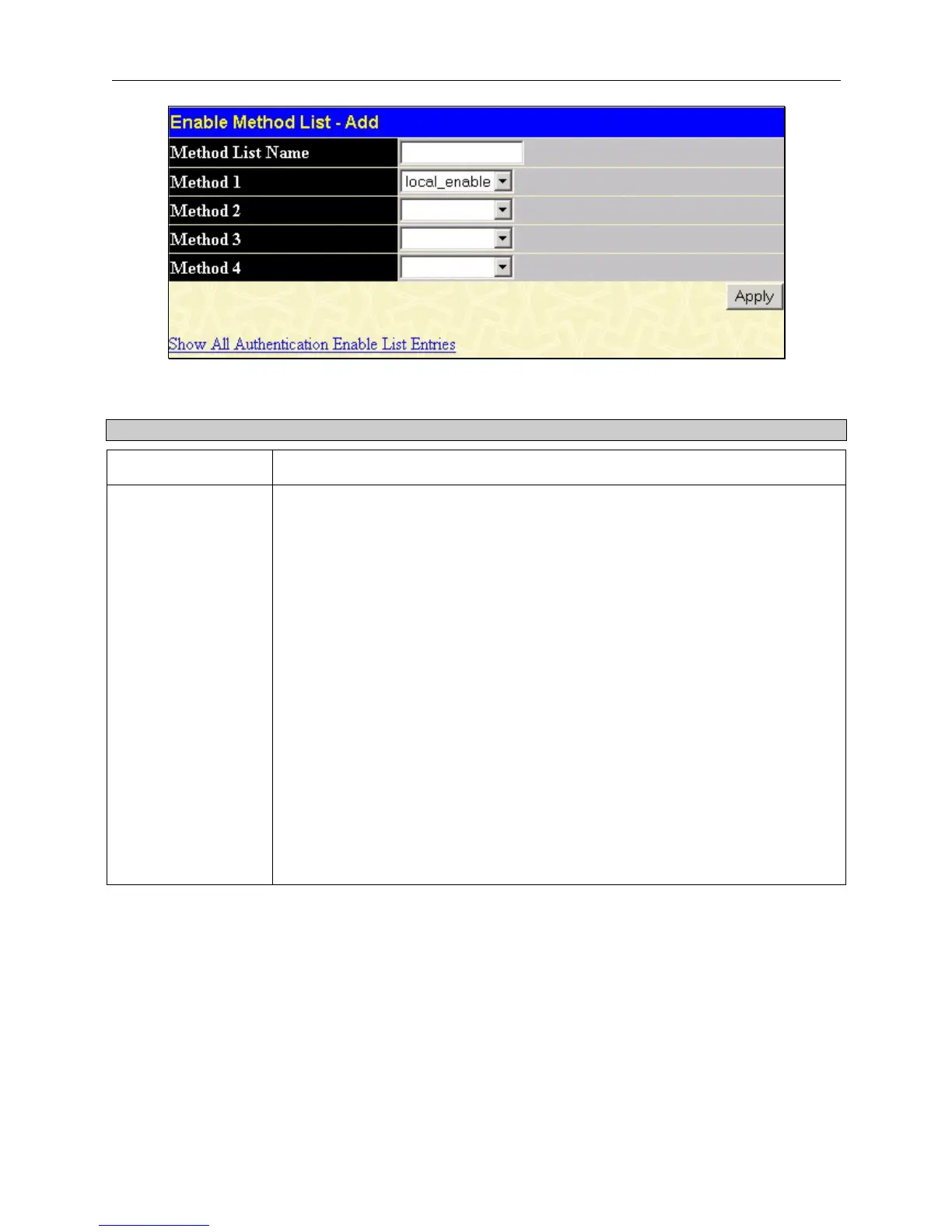 To define an Enable Login Method List, set the following parameters and click Apply: