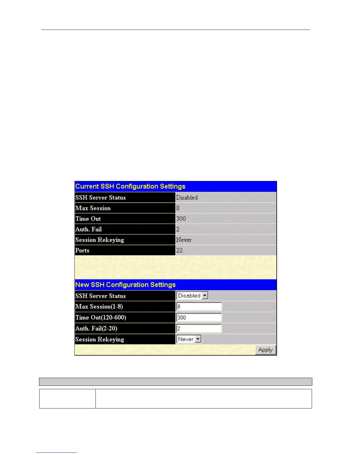 To configure the SSH server on the Switch, modify the following parameters and click Apply: