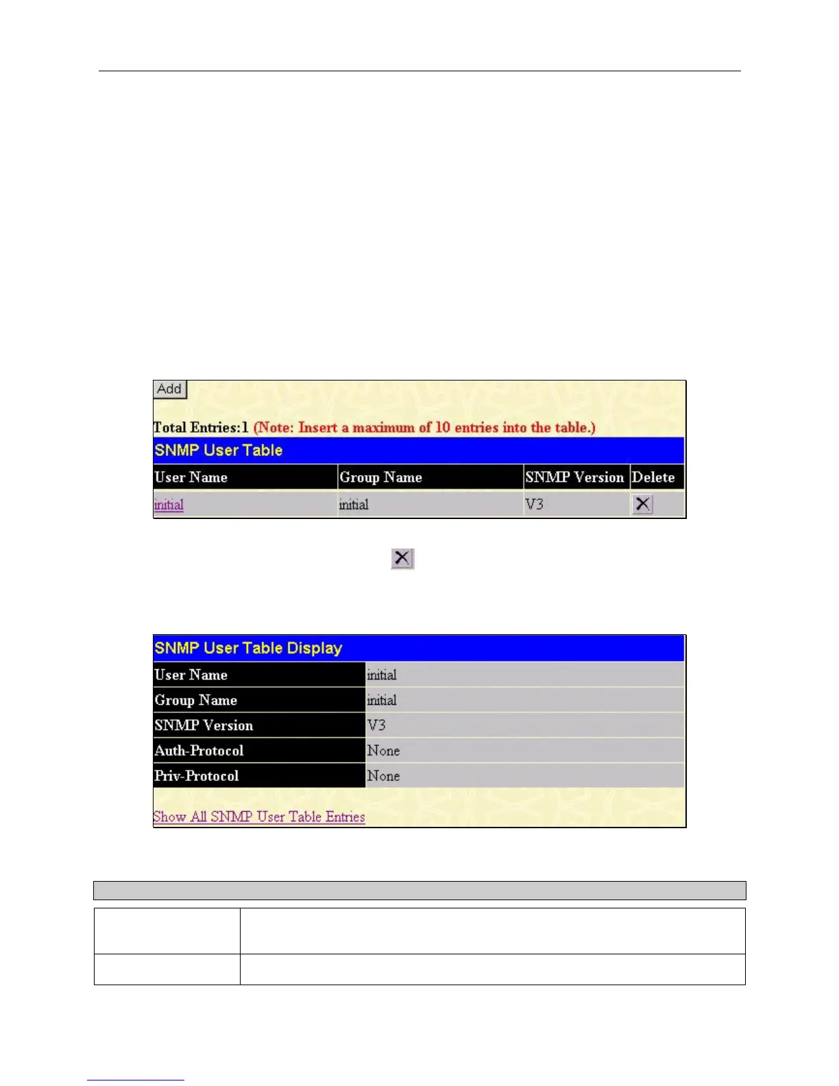 The SNMP User Table displays all of the SNMP User's currently configured on the Switch.