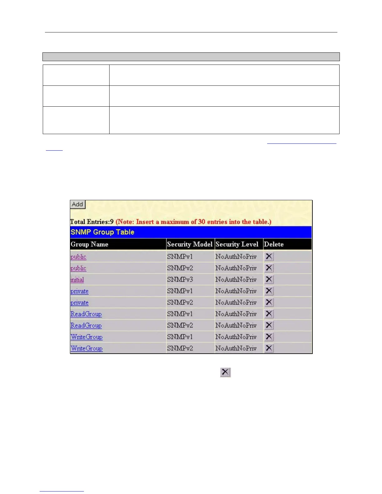 To delete an existing SNMP Group Table entry, click the corresponding