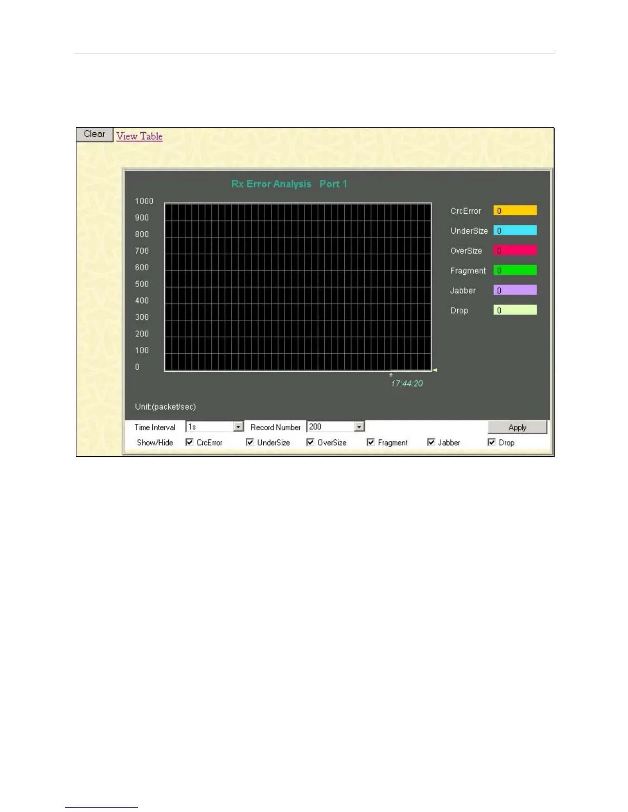 Click the Received(RX) link in the Error folder of the Monitoring menu to view the following graph of error packets