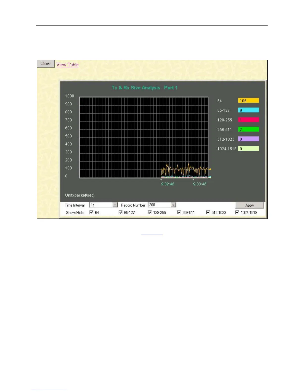 The Web Manager allows packets received by the Switch, arranged in six groups and classed by size, to be viewed as