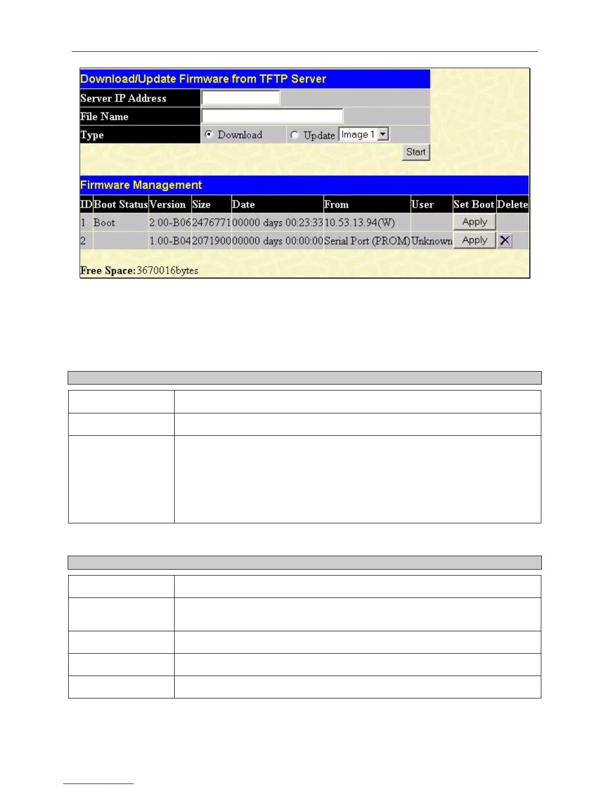 Information about firmware on the Switch can be viewed in the Firmware Management table in the same screen. It holds