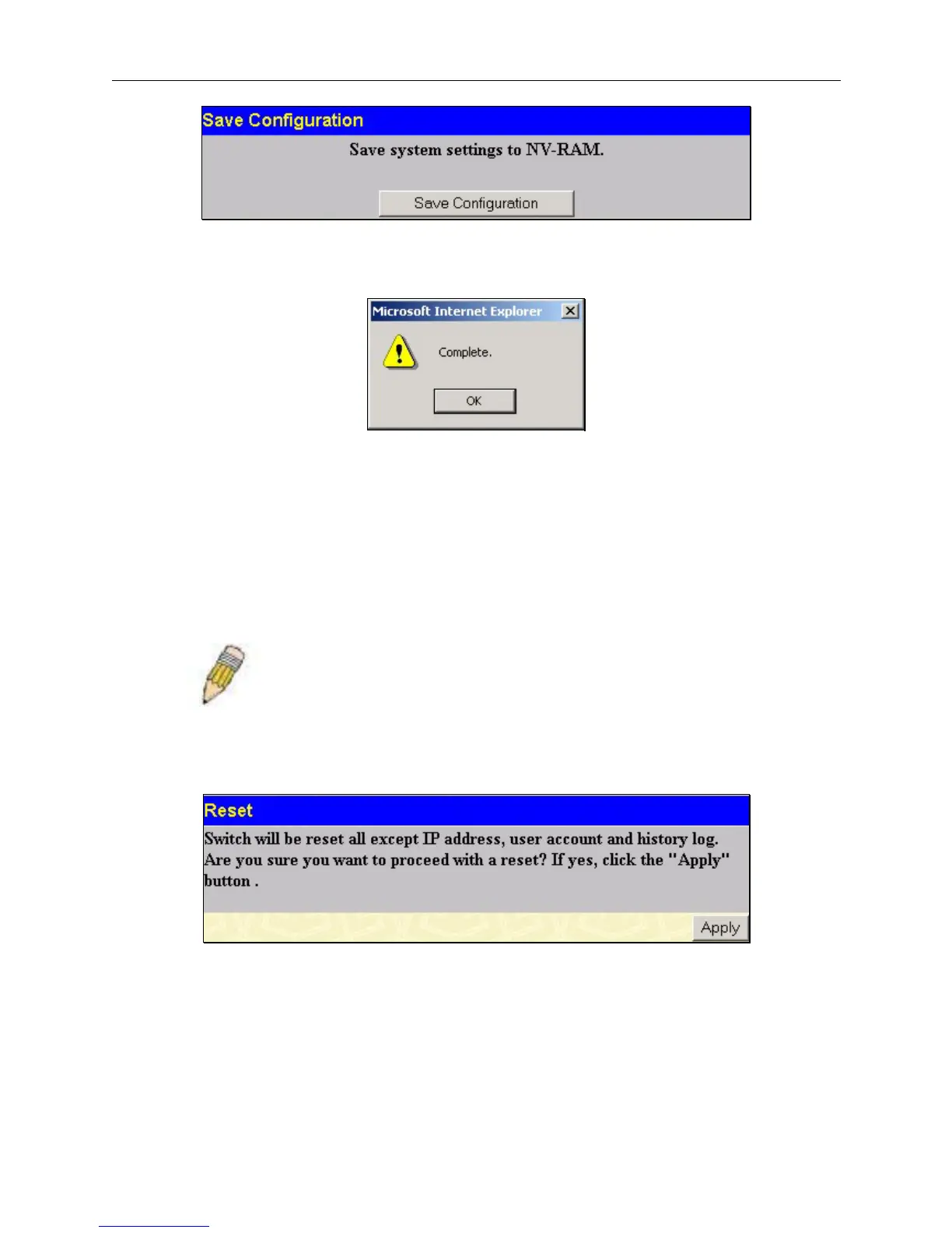 Click the Save Configuration button to save the current switch configuration in NV-RAM. The following dialog box will