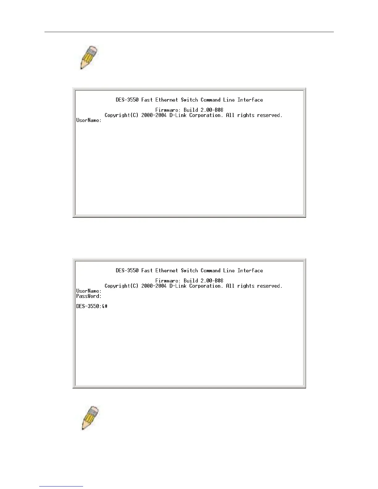 Press Enter in both the Username and Password fields. You will be given access to the command prompt DES-3550:4#