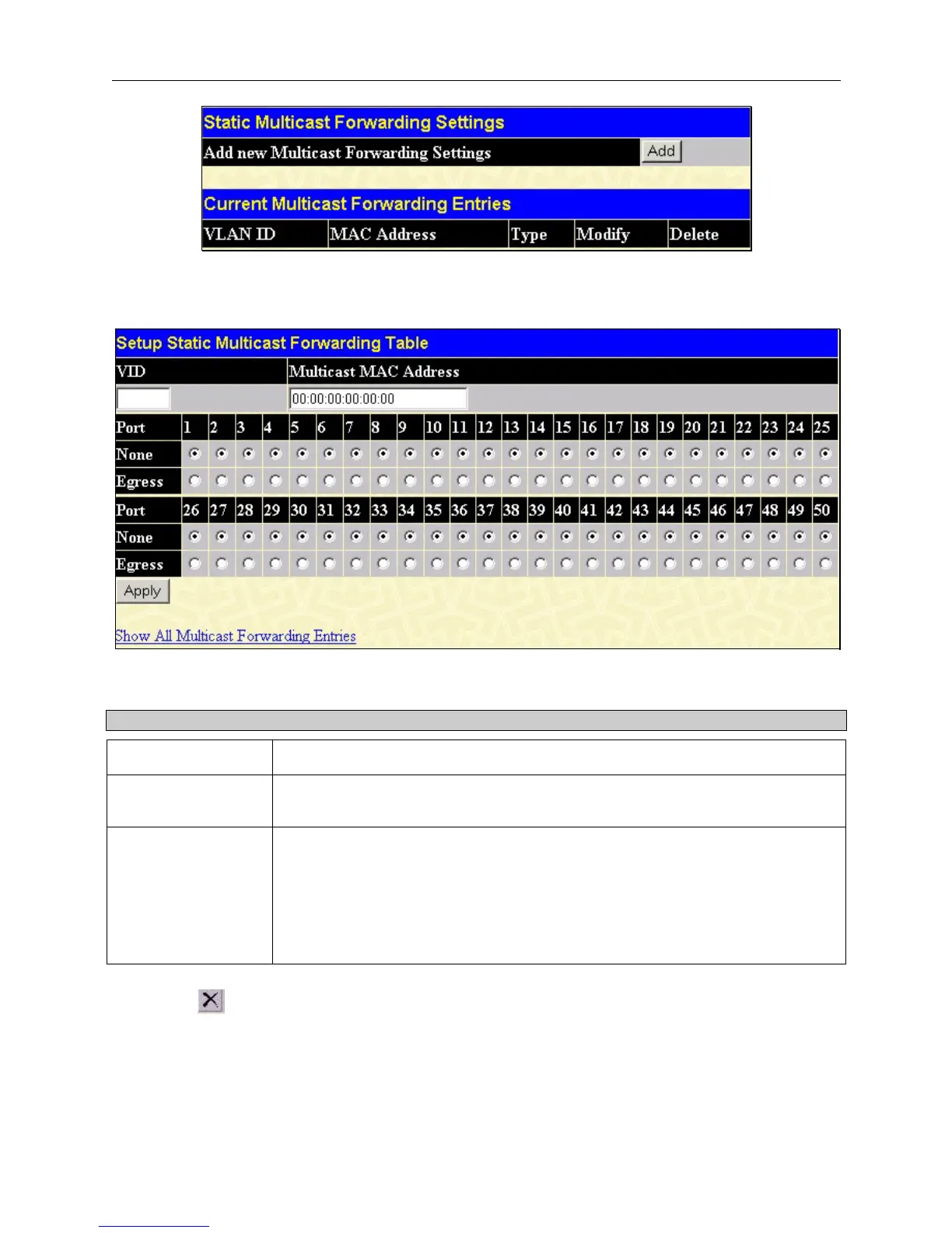 Click Apply to implement the changes made. To delete an entry in the Static Multicast Forwarding Table, click the