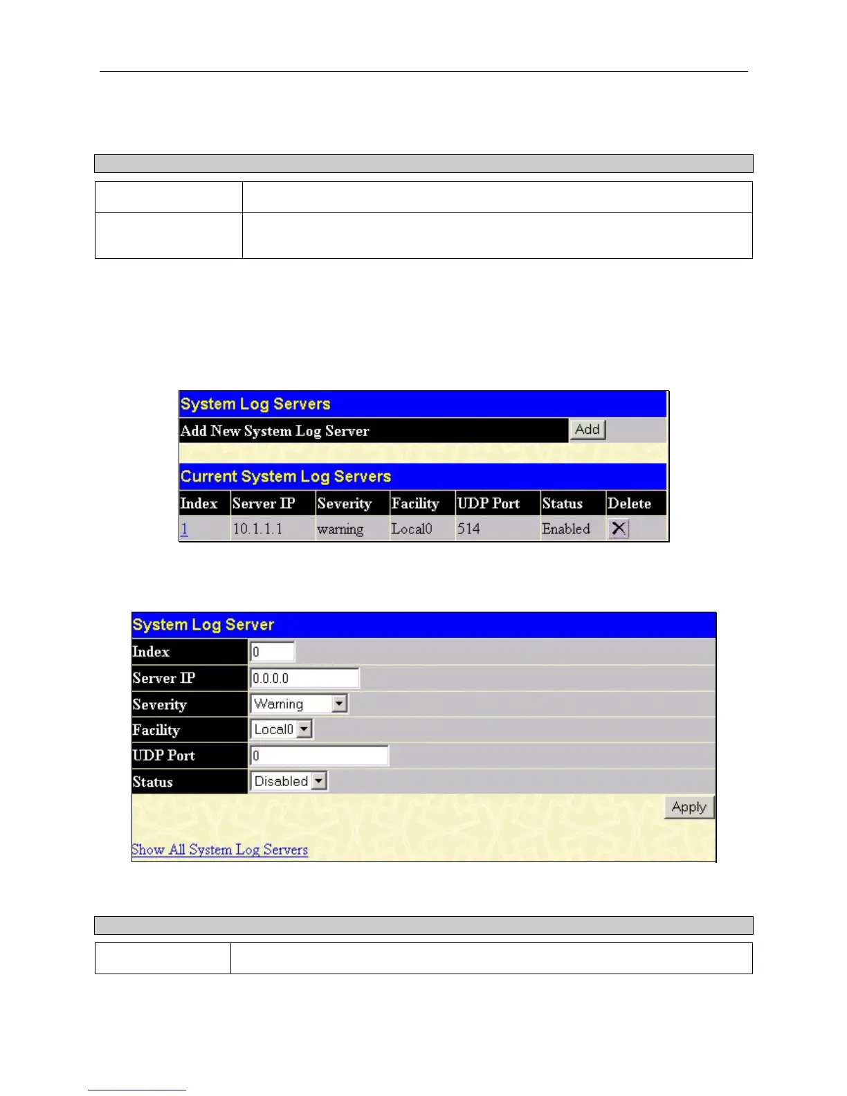 The Switch can send Syslog messages to up to four designated servers using the System Log Server. In the Configuration