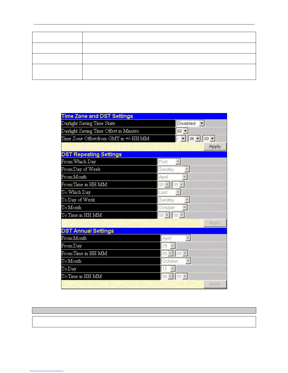 The following are screens used to configure time zones and Daylight Savings time settings for SNTP. Open the