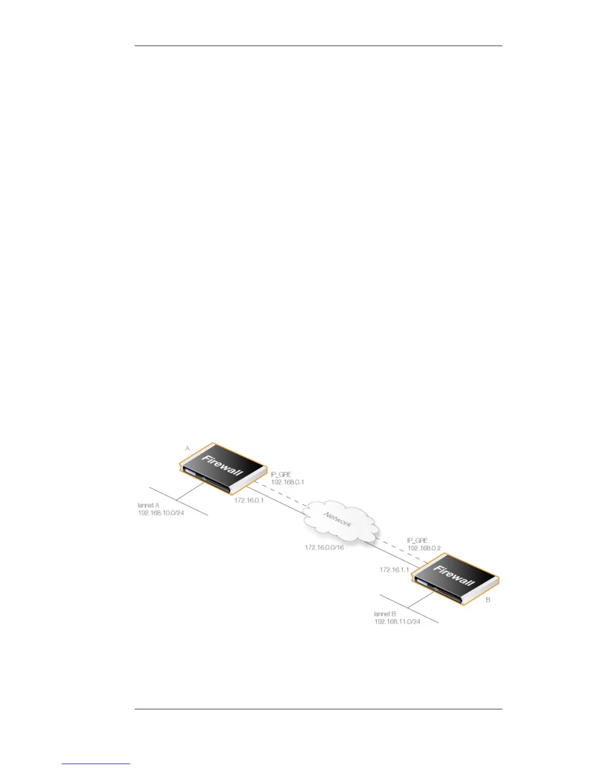The diagram above shows a typical GRE scenario, where two NetDefend Firewalls A and B must