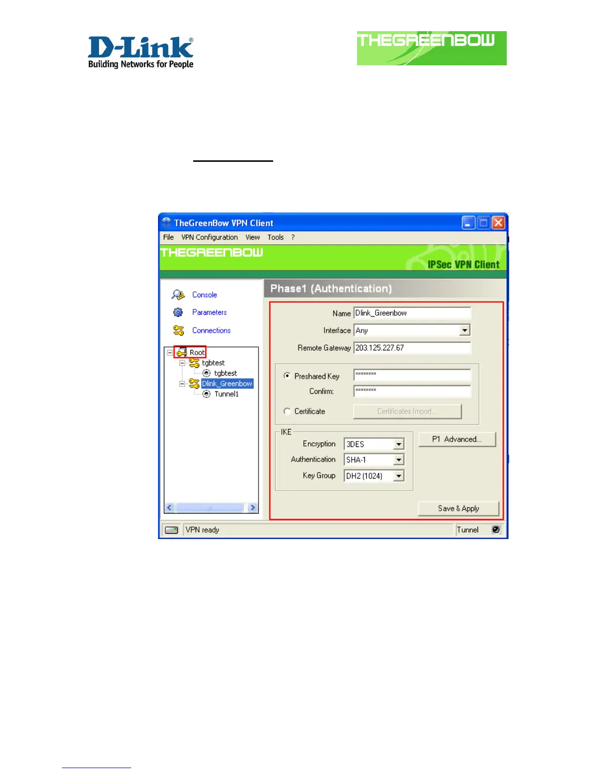 Note: the Preshared Key and IKE must be the same setting set in the DFL-800.