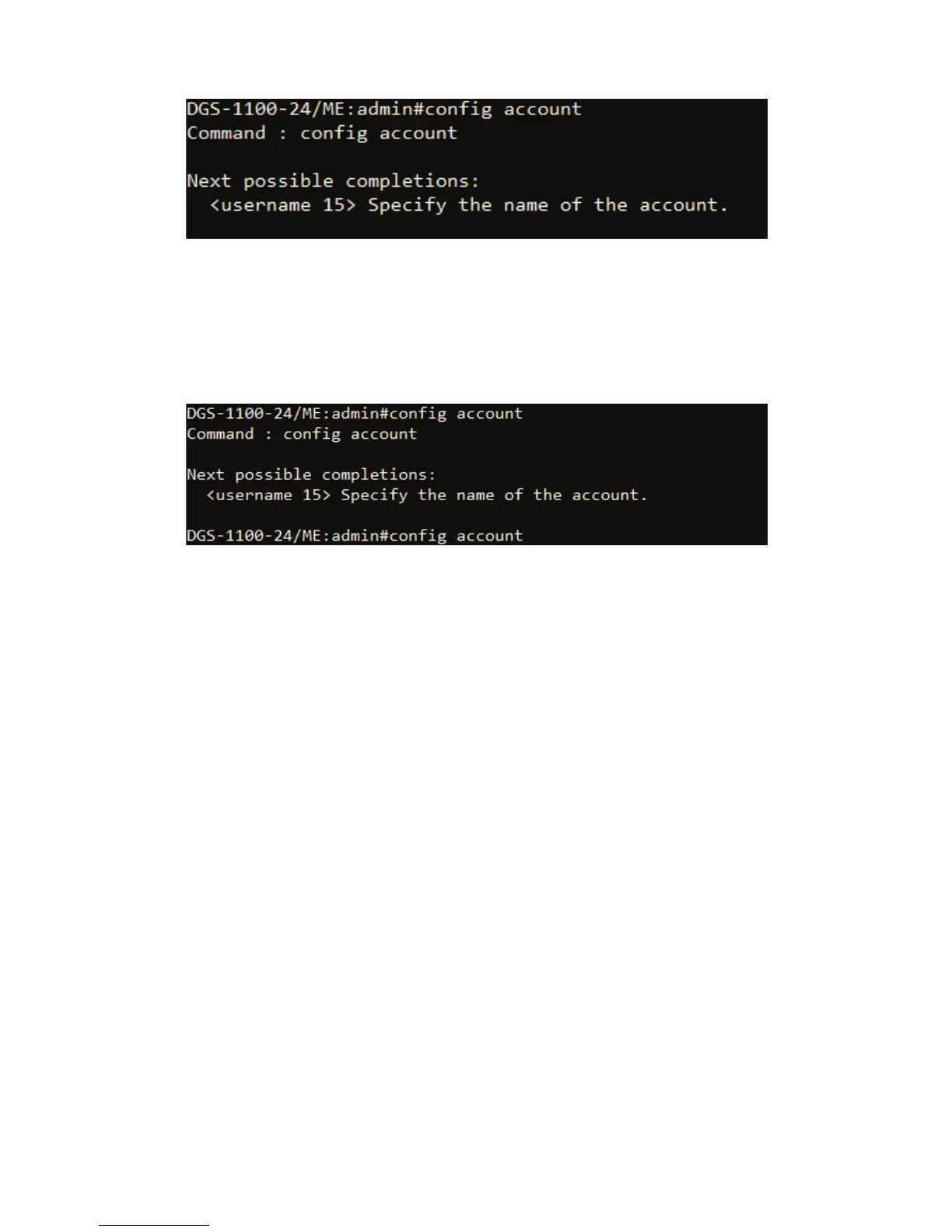 prompt to enter the <username> with the message, command: config account. Every command in the