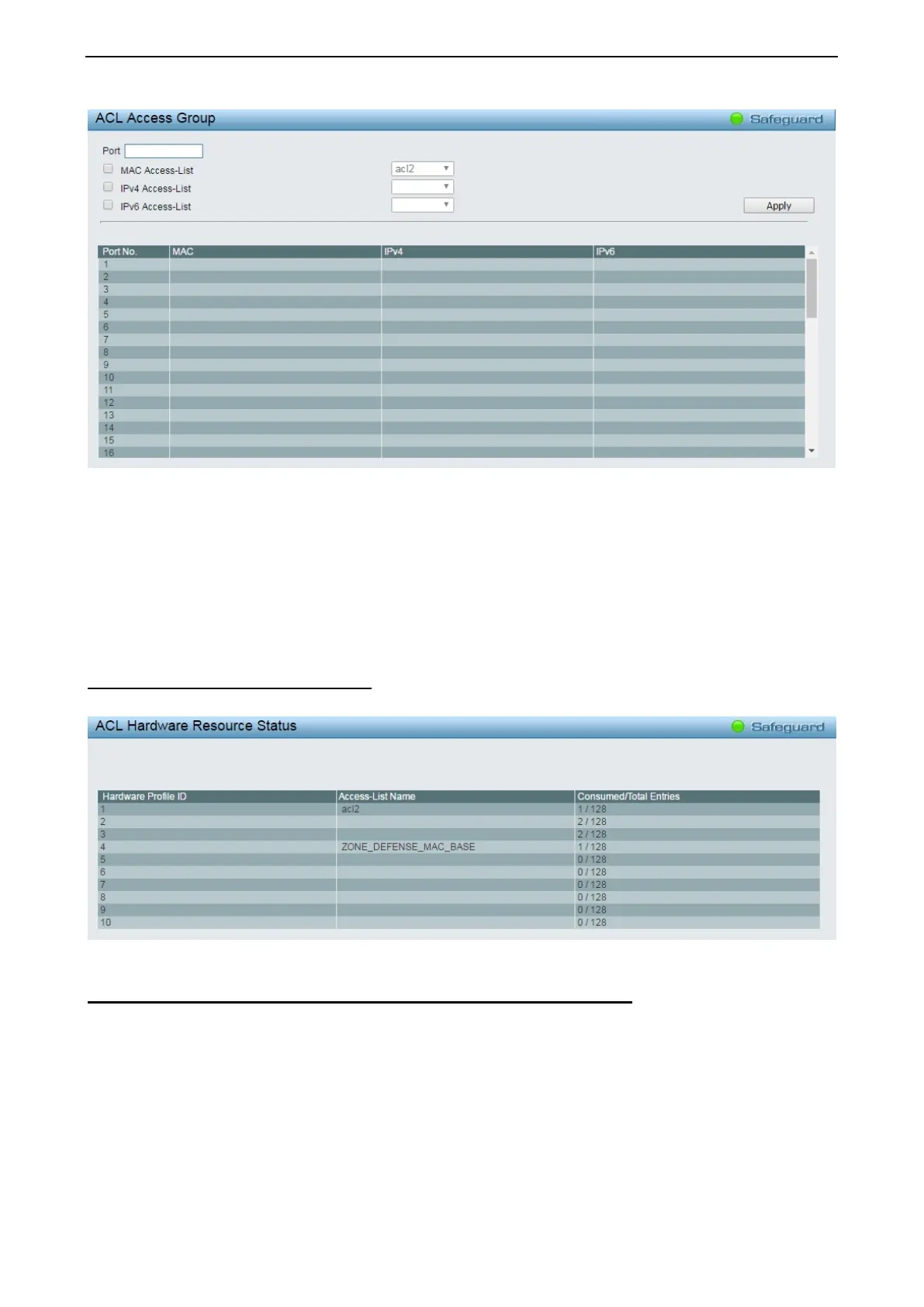 The ACL Hardware Resource Status page displays the information of ACL Hardware Resource status.