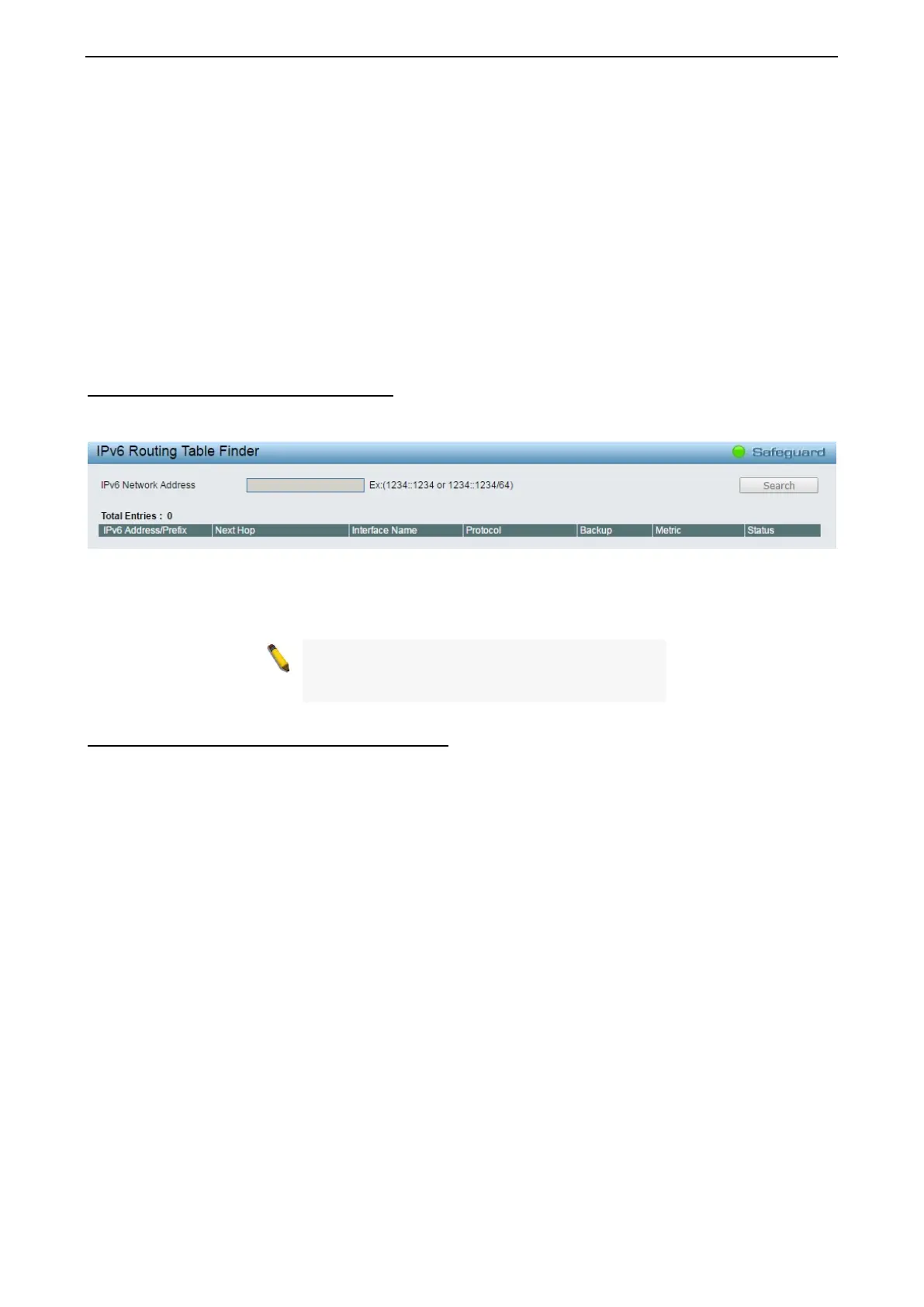 The IPv6 Routing Table Finder page shows the current Ipv6 routing table of the Switch. To find a specific