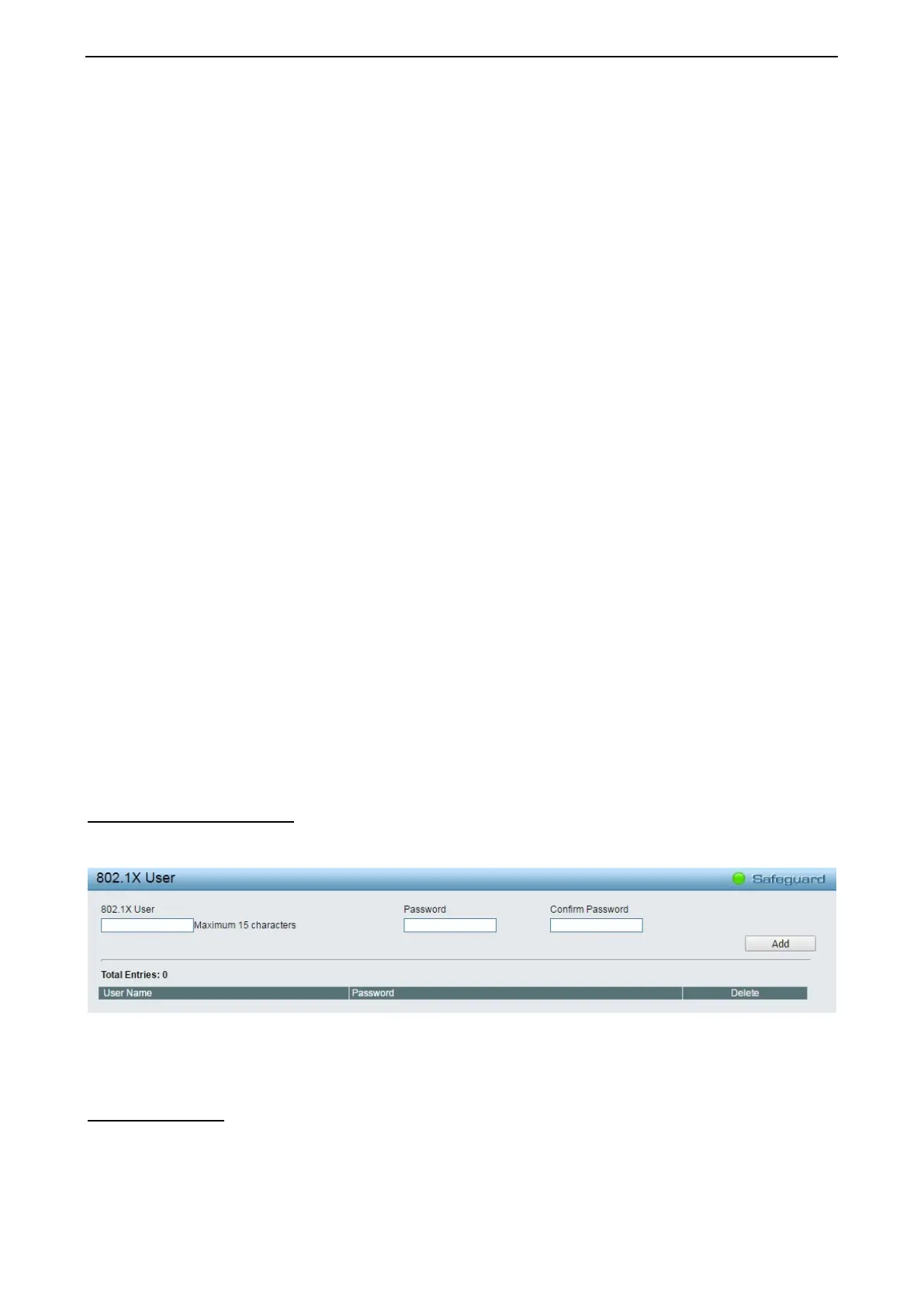 The 802.1X User page allows user to set different local users on the Switch. Enter a 802.1X User name,