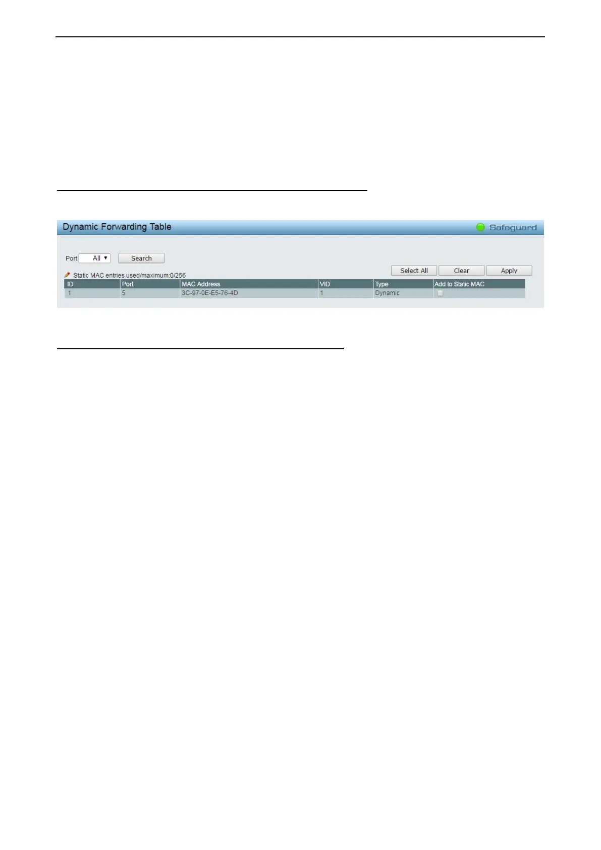 For each port, this table displays the MAC address learned by the Switch. To add a MAC address to the