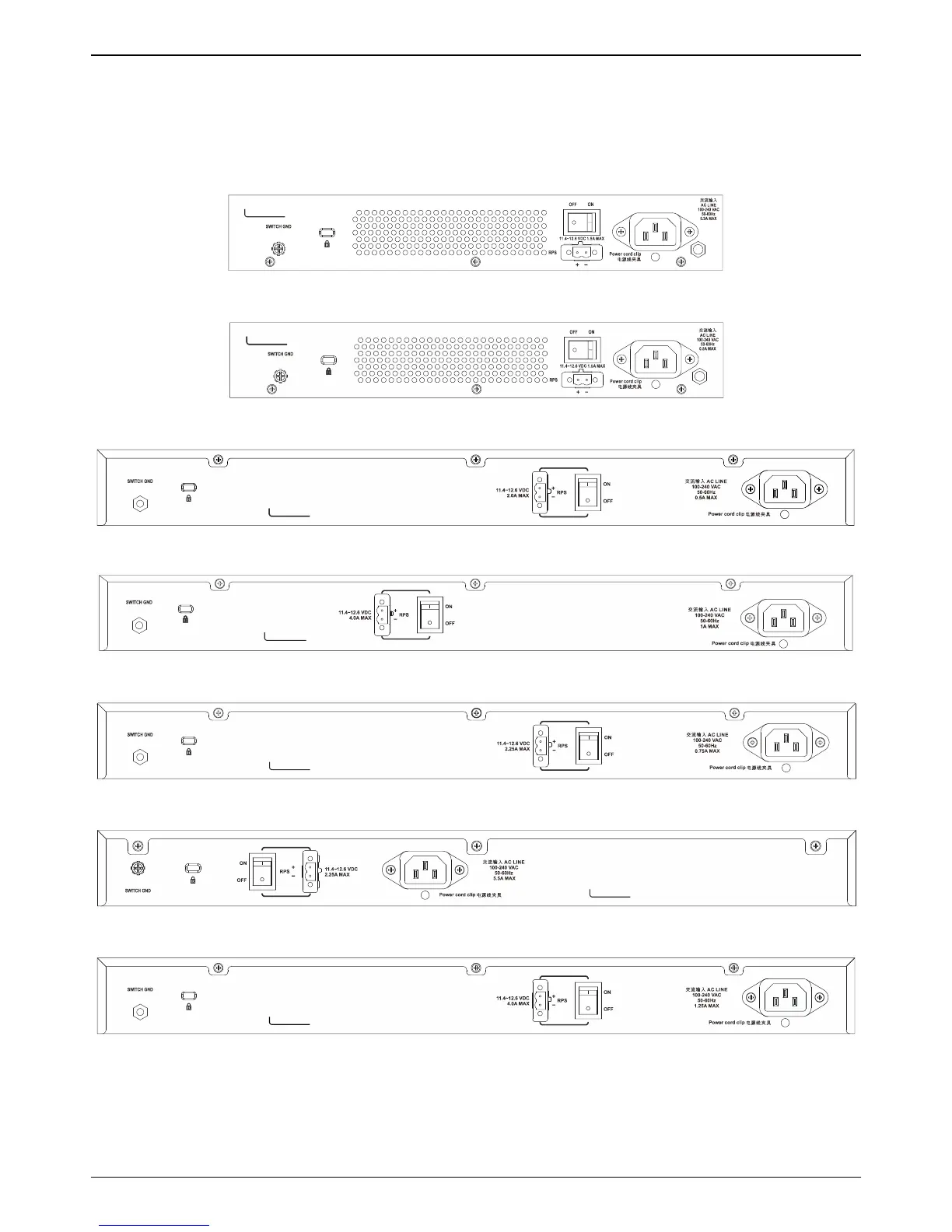 The rear panel of switches in this series features an AC power socket, power cord clip hole, a DC power RPS port