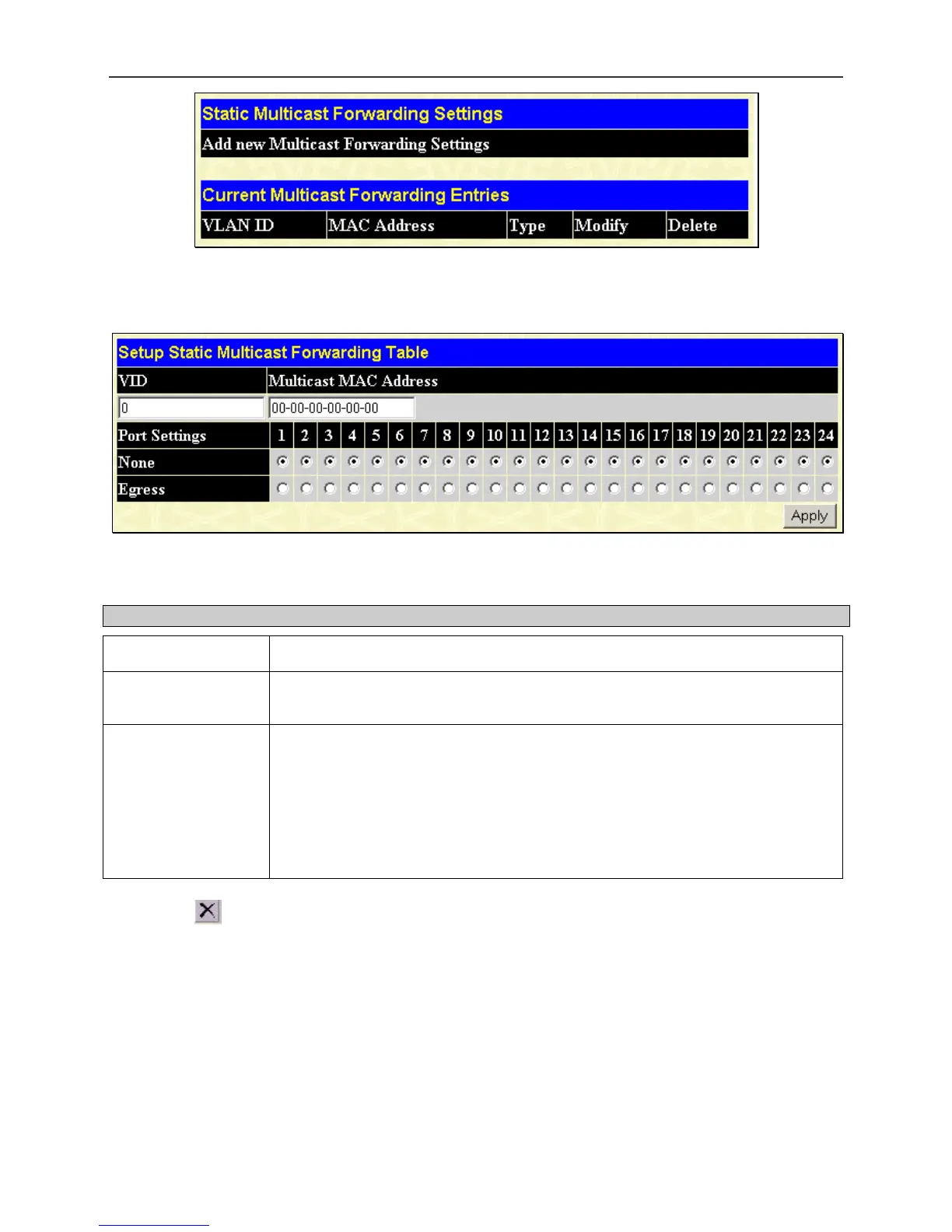 Click Apply to implement the changes made. To delete an entry in the Static Multicast Forwarding Table, click the