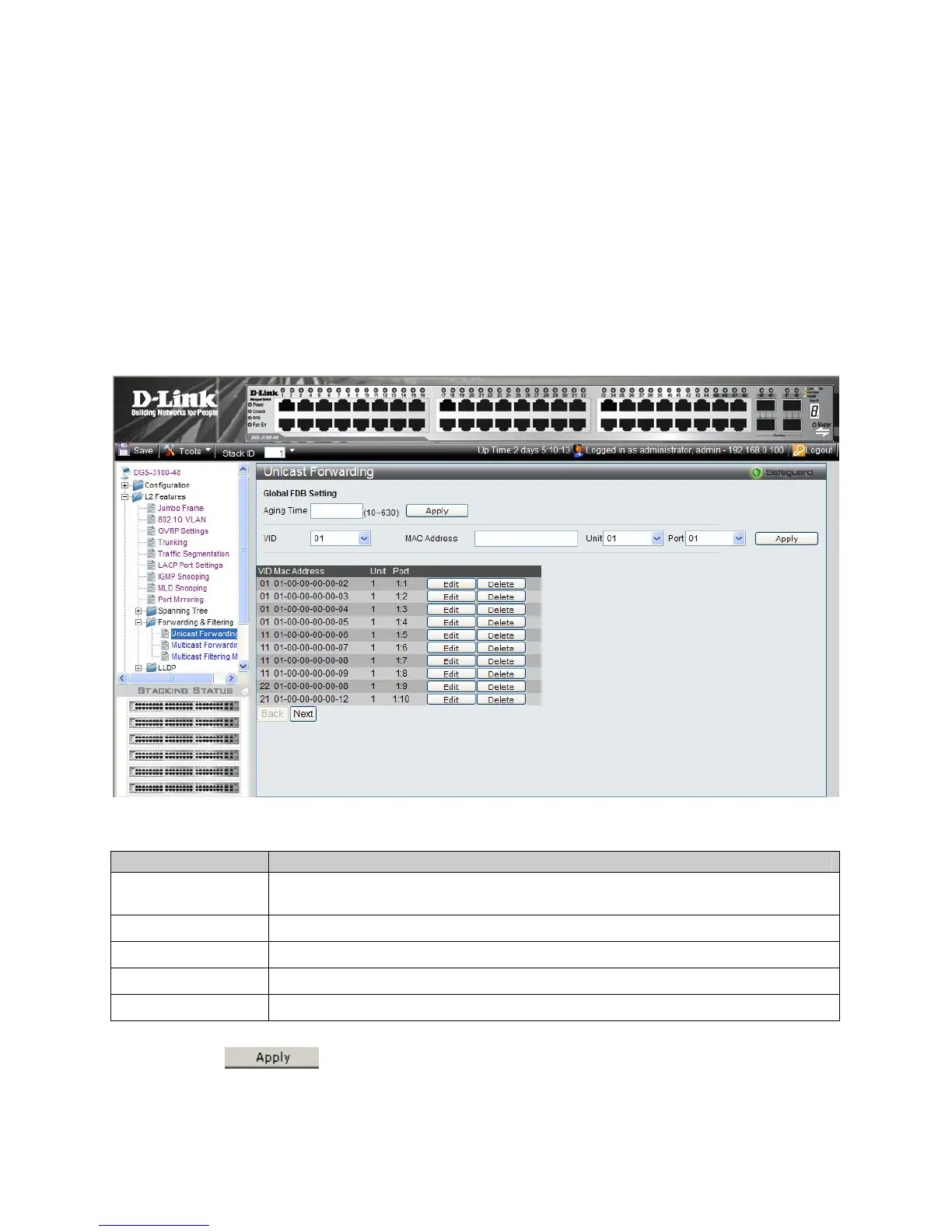1. Click L2 Features > Forward & Filtering > Unicast Forwarding. The Unicast Forwarding Page opens:
