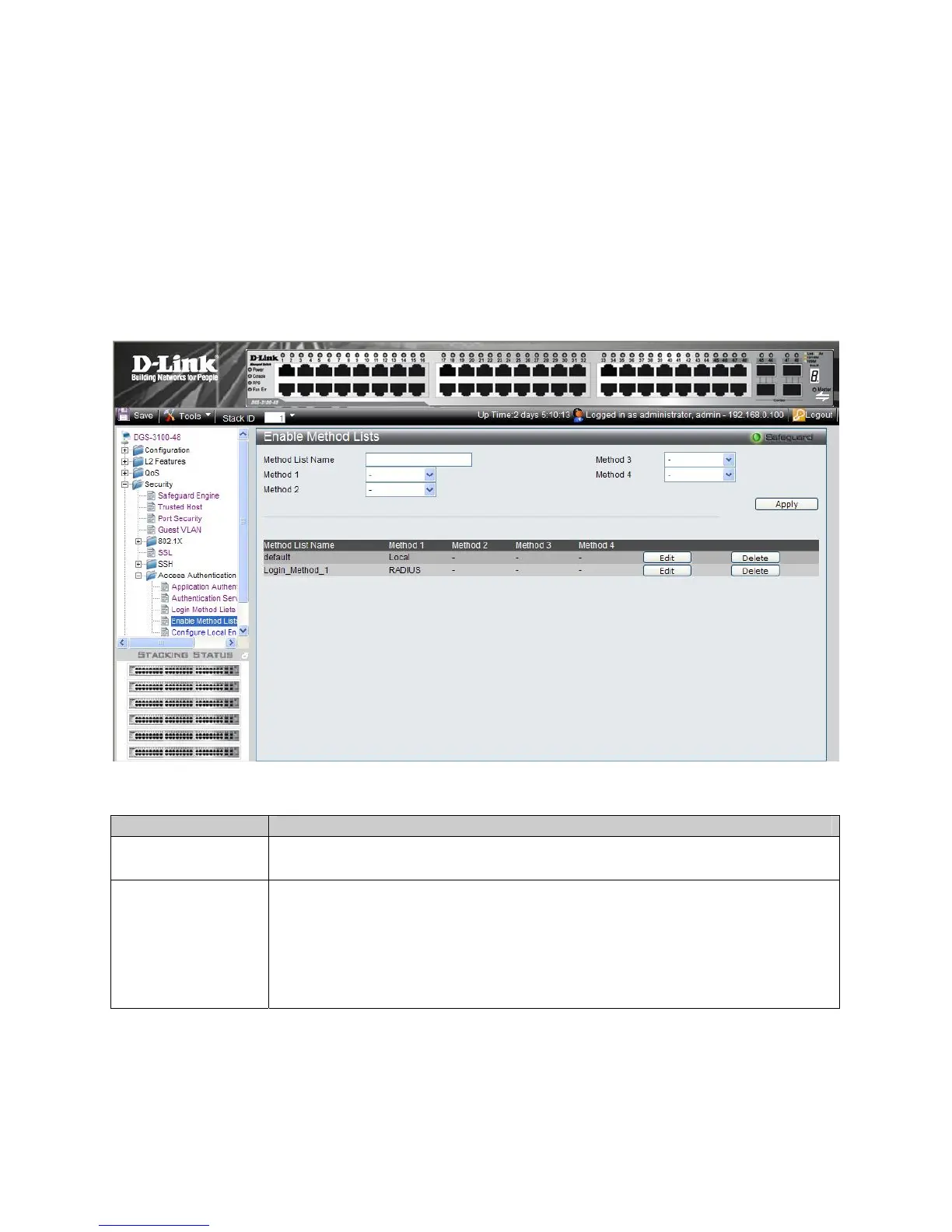 1. Click Security > Access Authentication Control > Enable Method Lists. The Enable Method Lists Page