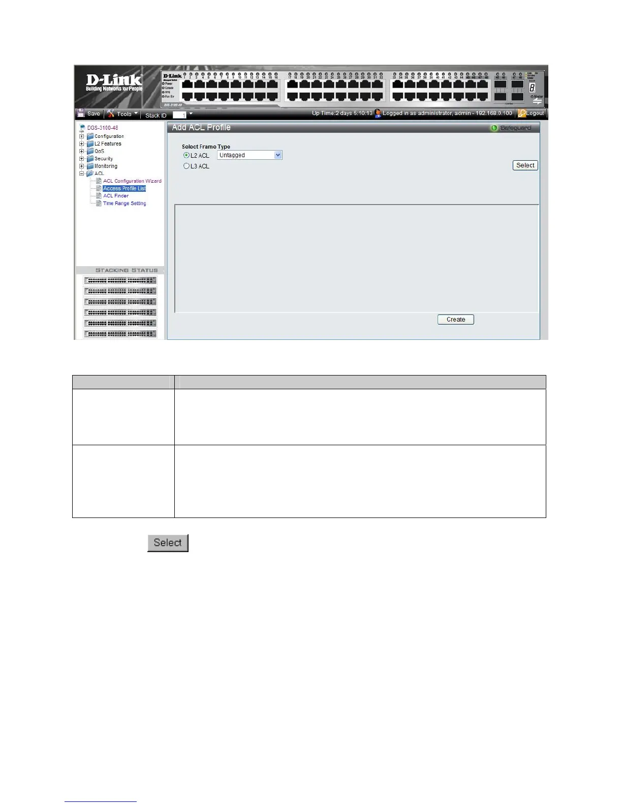 The Add ACL Profile Page updates accordingly, enabling selection of the packet field to