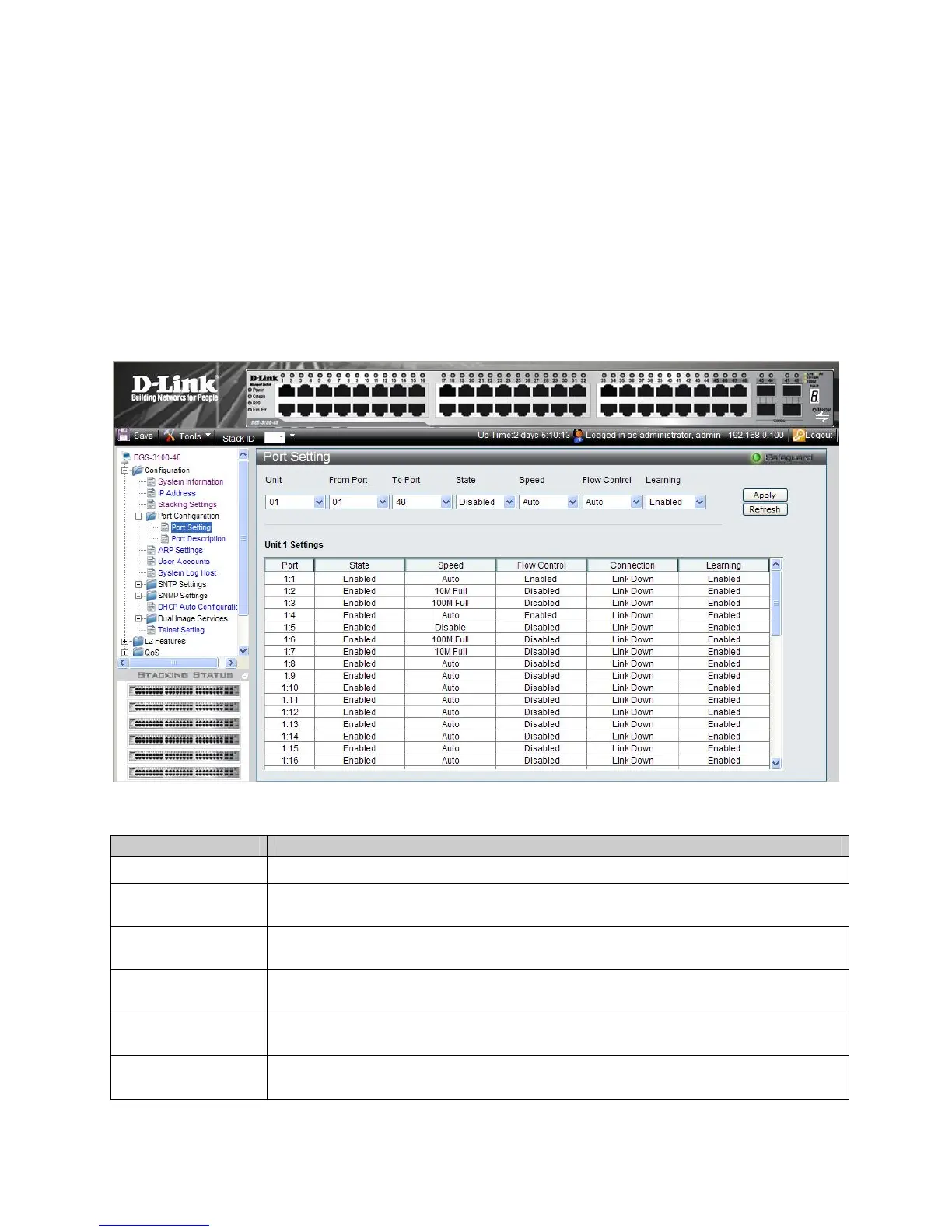 1. Click Configuration >Port Configuration > Port Setting. The Port Setting Page opens:
