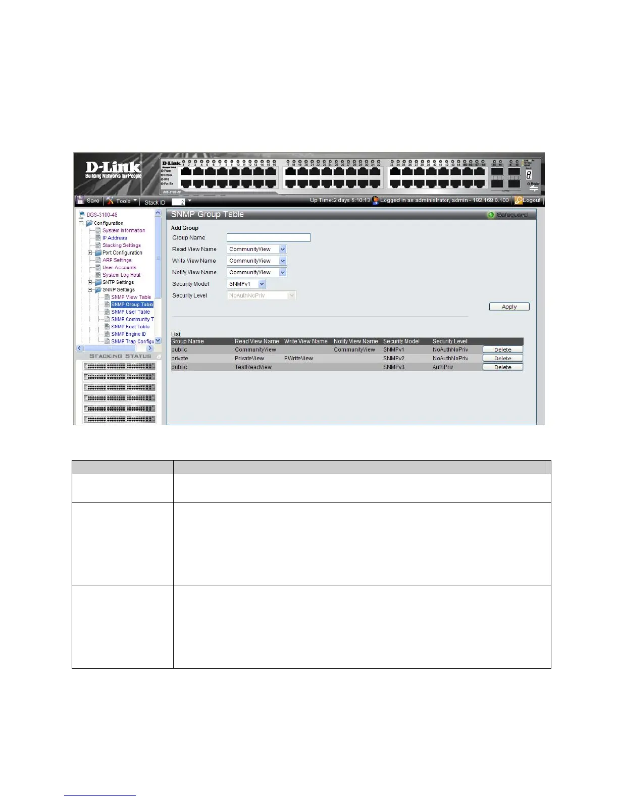 The SNMP Group Table Page provides information for creating SNMP groups and assigning SNMP access control