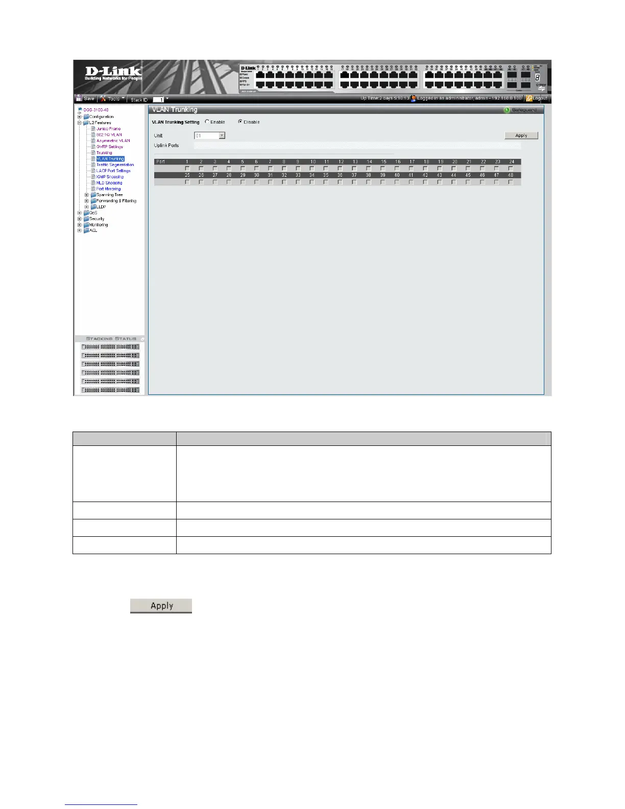 Defines the stacking member’s Unit ID for which VLAN Trunking parameters are displayed
