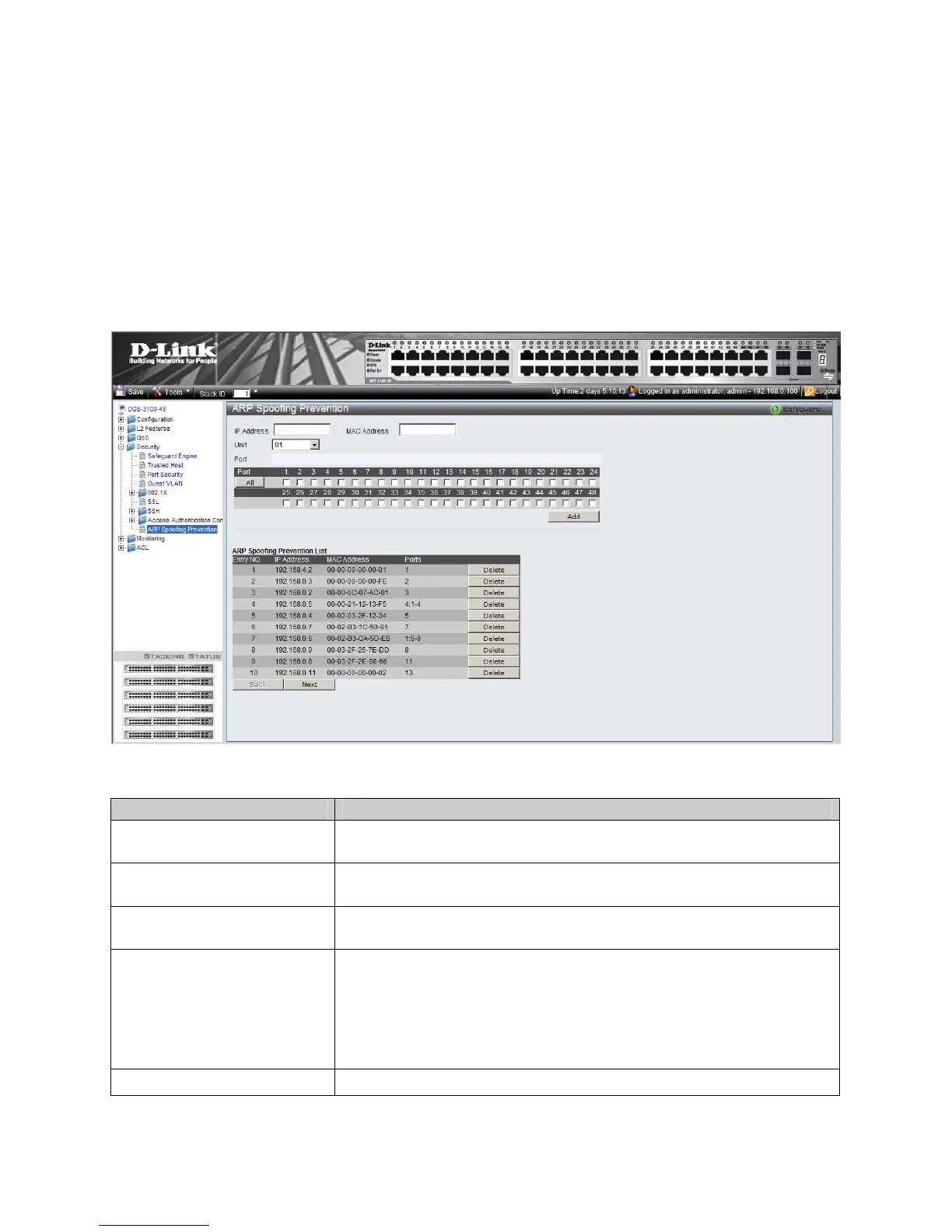 ters, as well as defining ARP Spoofing Prevention Log parameters. Up to 240 entries can be defined.