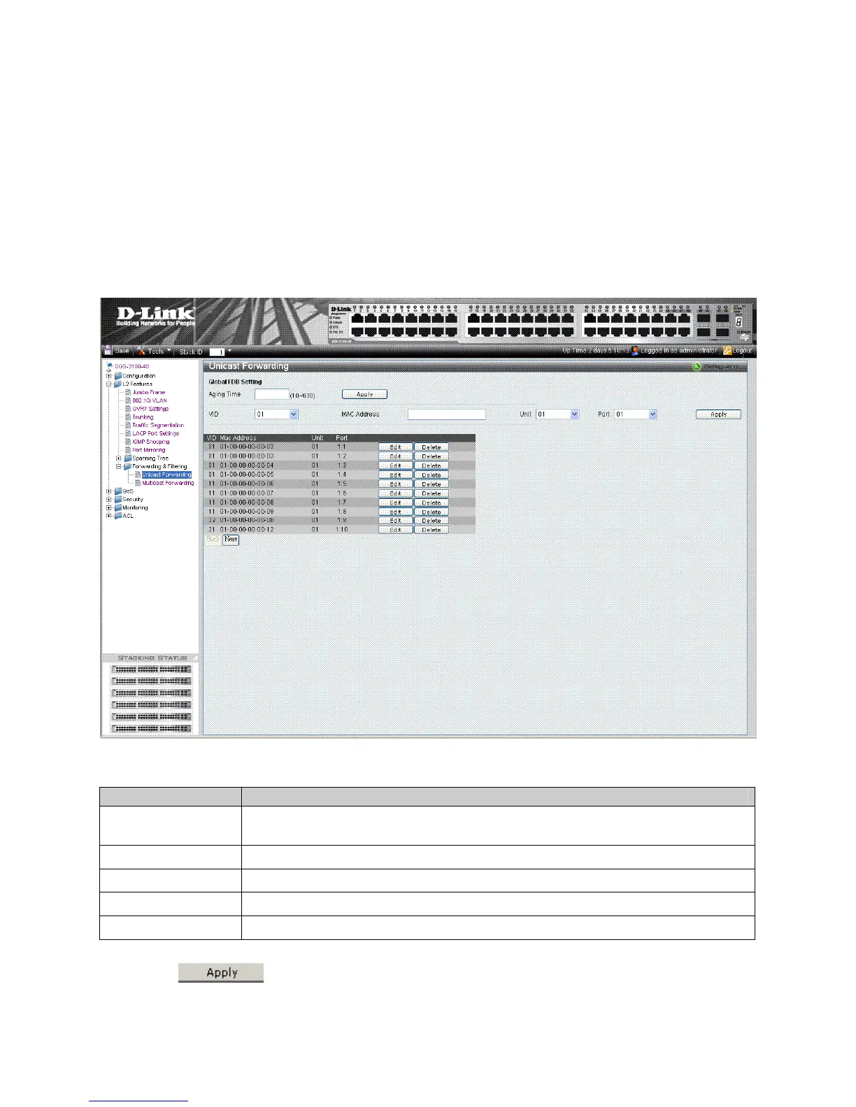 1. Click L2 Features > Forward & Filtering > Unicast Forwarding. The Unicast Forwarding Page opens: