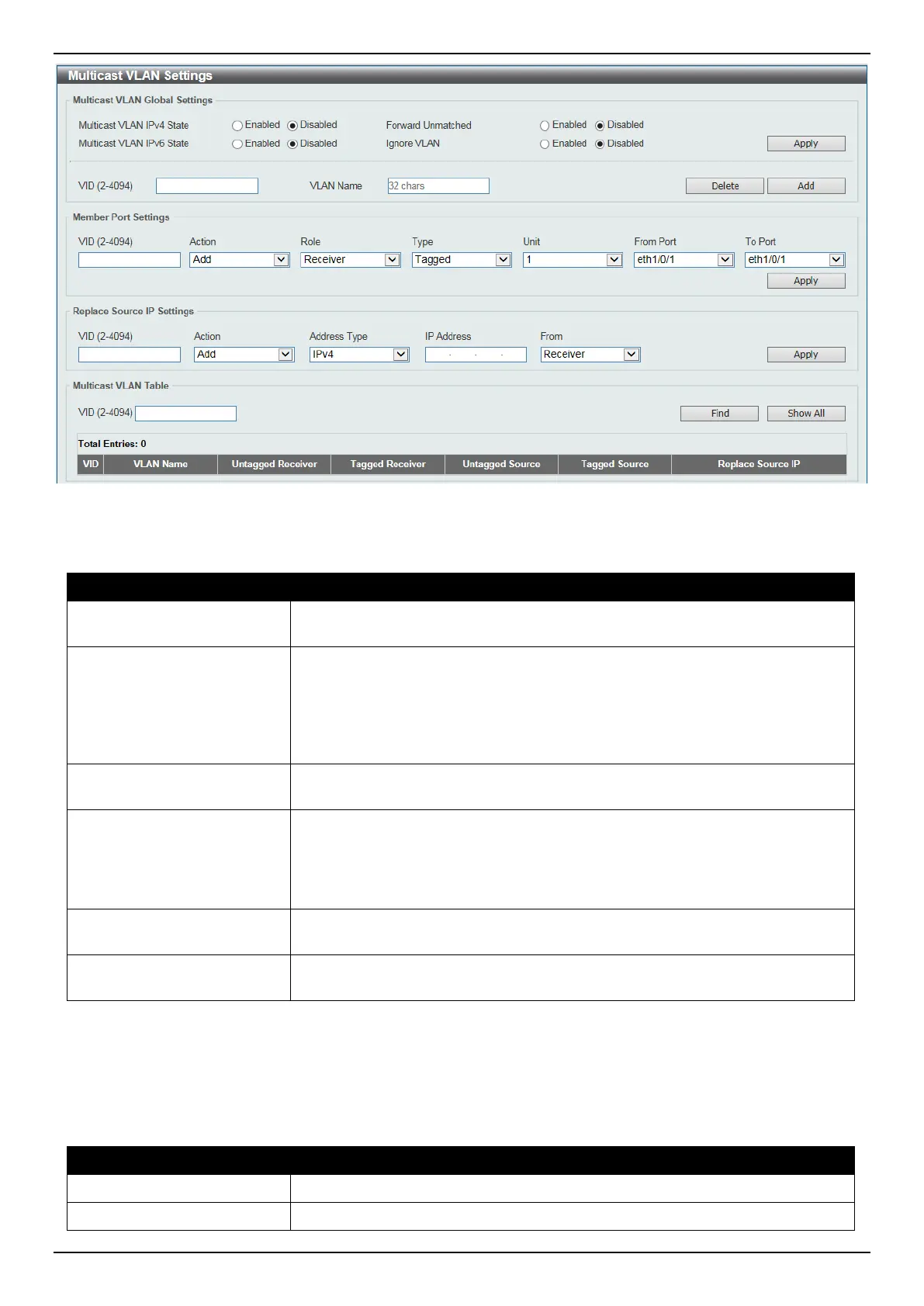 The fields that can be configured in Multicast VLAN Global Settings are described below: