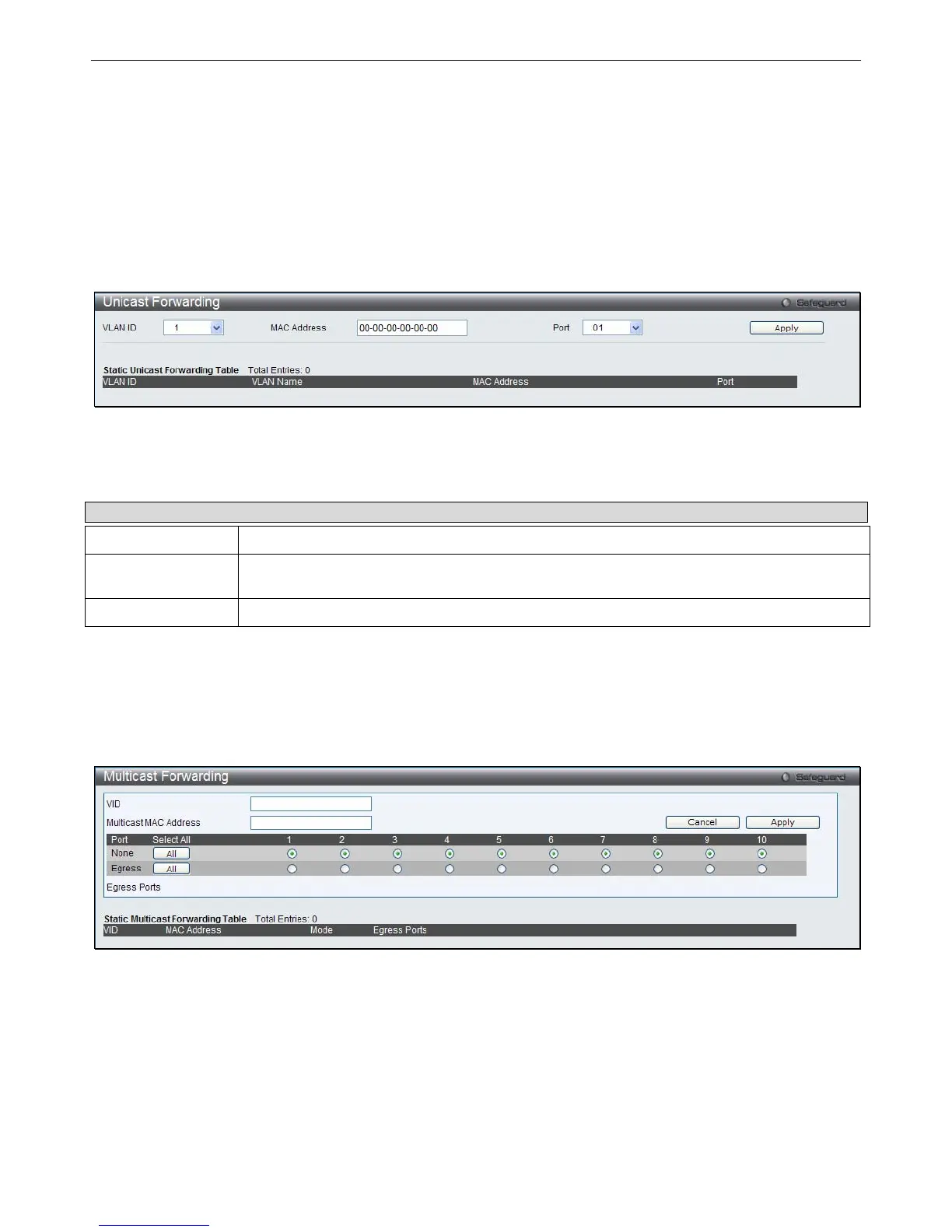To view the following window, click L2 Features > Forwarding & Filtering > Unicast Forwarding: