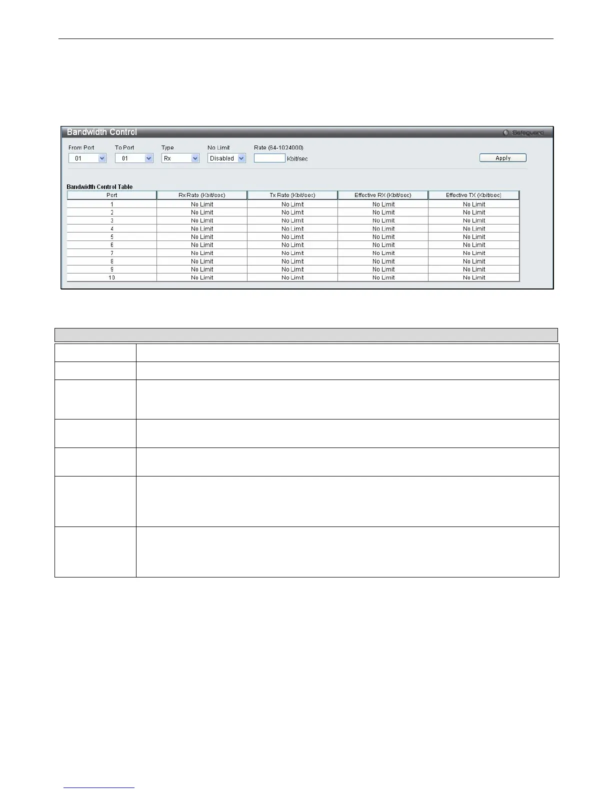 The bandwidth control settings are used to place a ceiling on the transmitting and receiving data rates for any selected port.