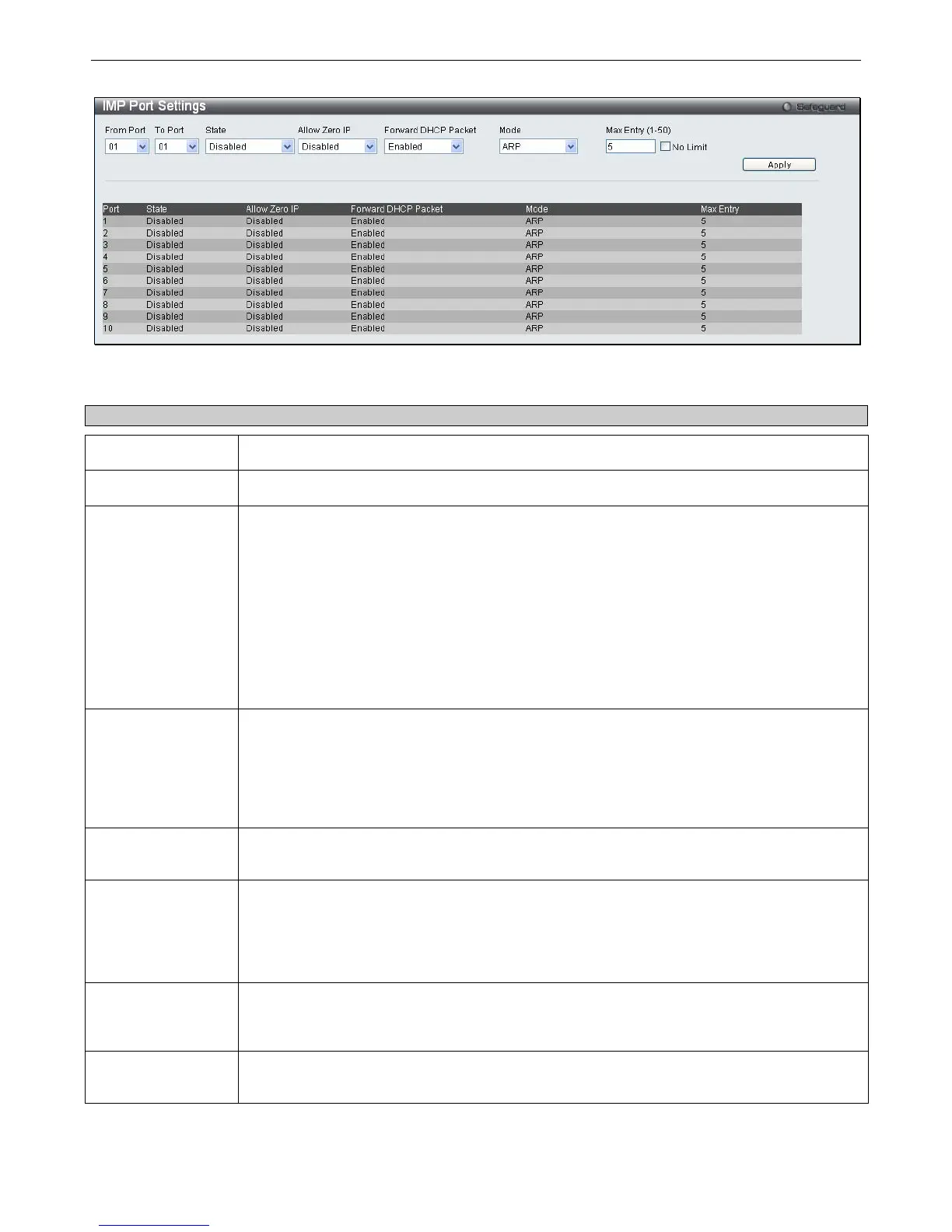 the entries for the ports. The port will check ARP packets and IP packets by IP-MAC-port