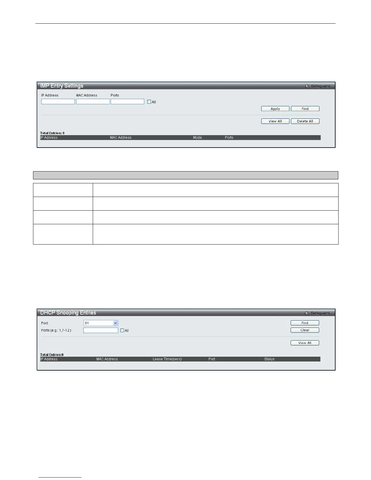 This table is used to create static IP-MAC-binding port entries and view all IMP entries on the Switch. Click Find to search for an