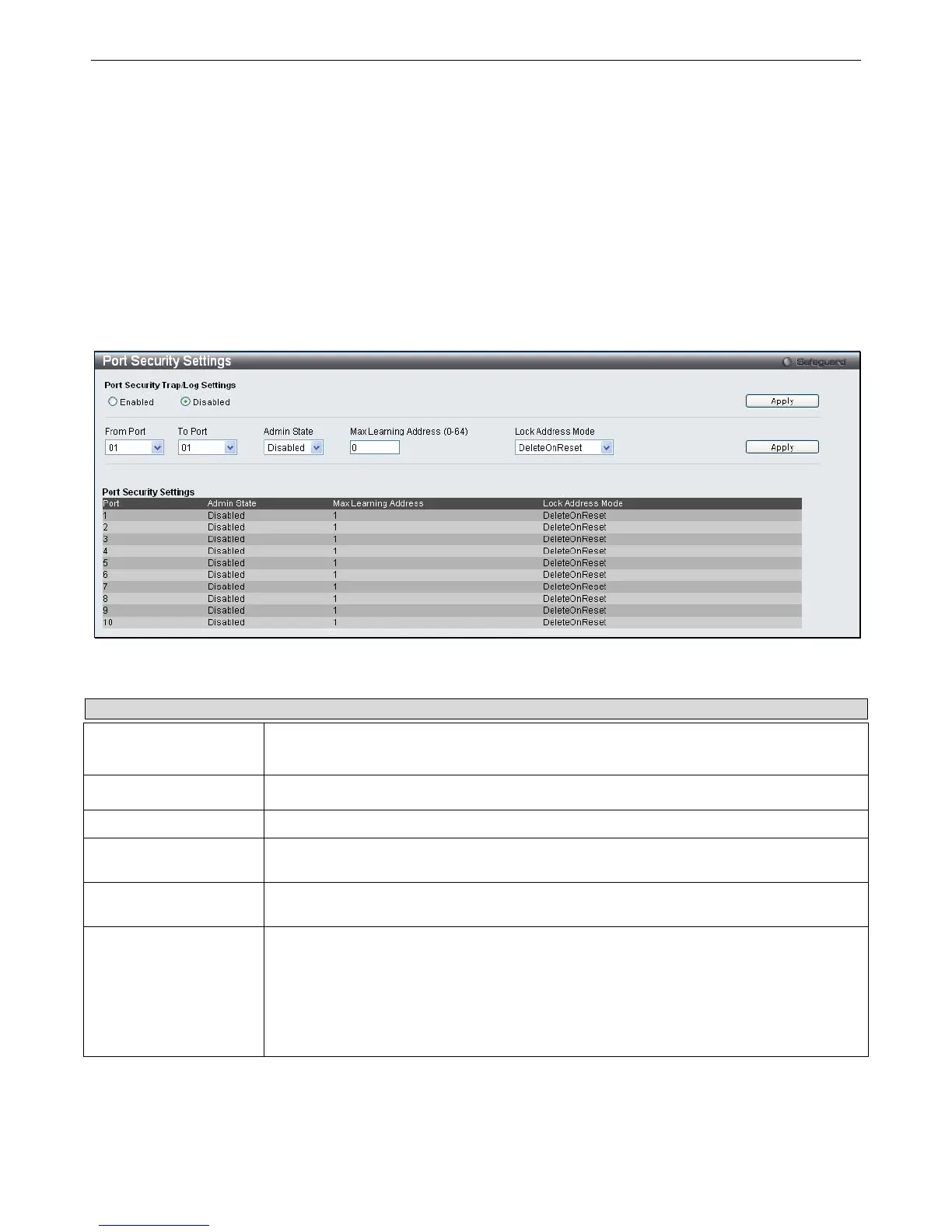 This pull-down menu allows the user to enable or disable Port Security (locked MAC