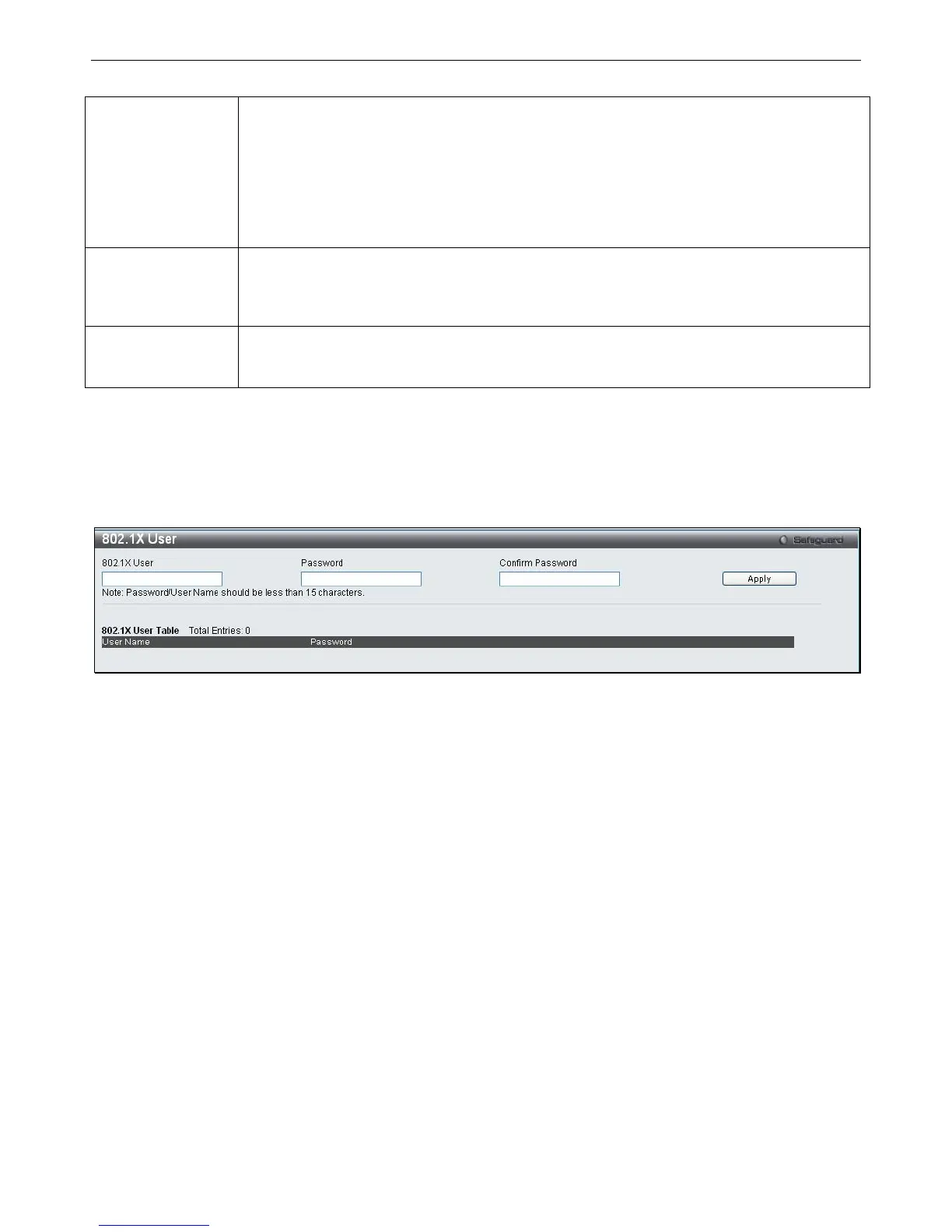 802.1X User Table at the bottom of the window. Click Apply to implement your configuration changes.