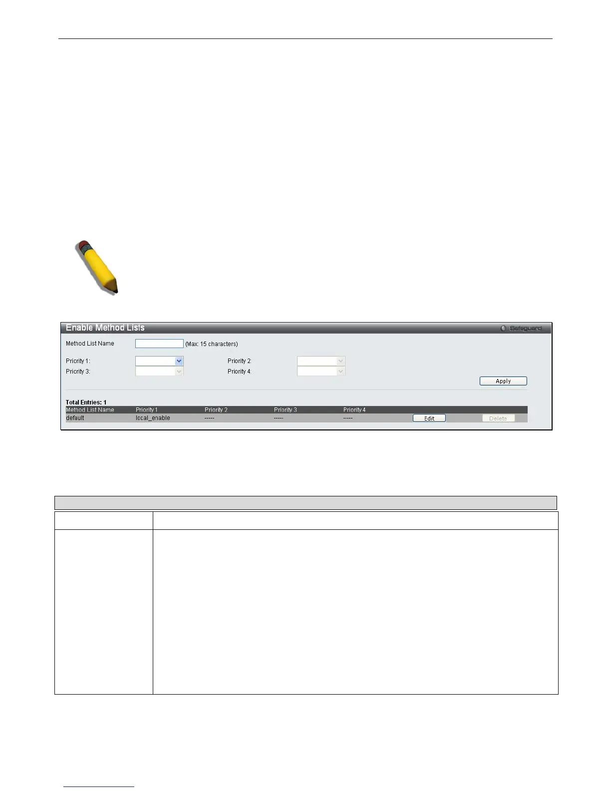 maximum of eight Enable Method Lists can be implemented on the Switch, one of which is a default Enable Method List. This