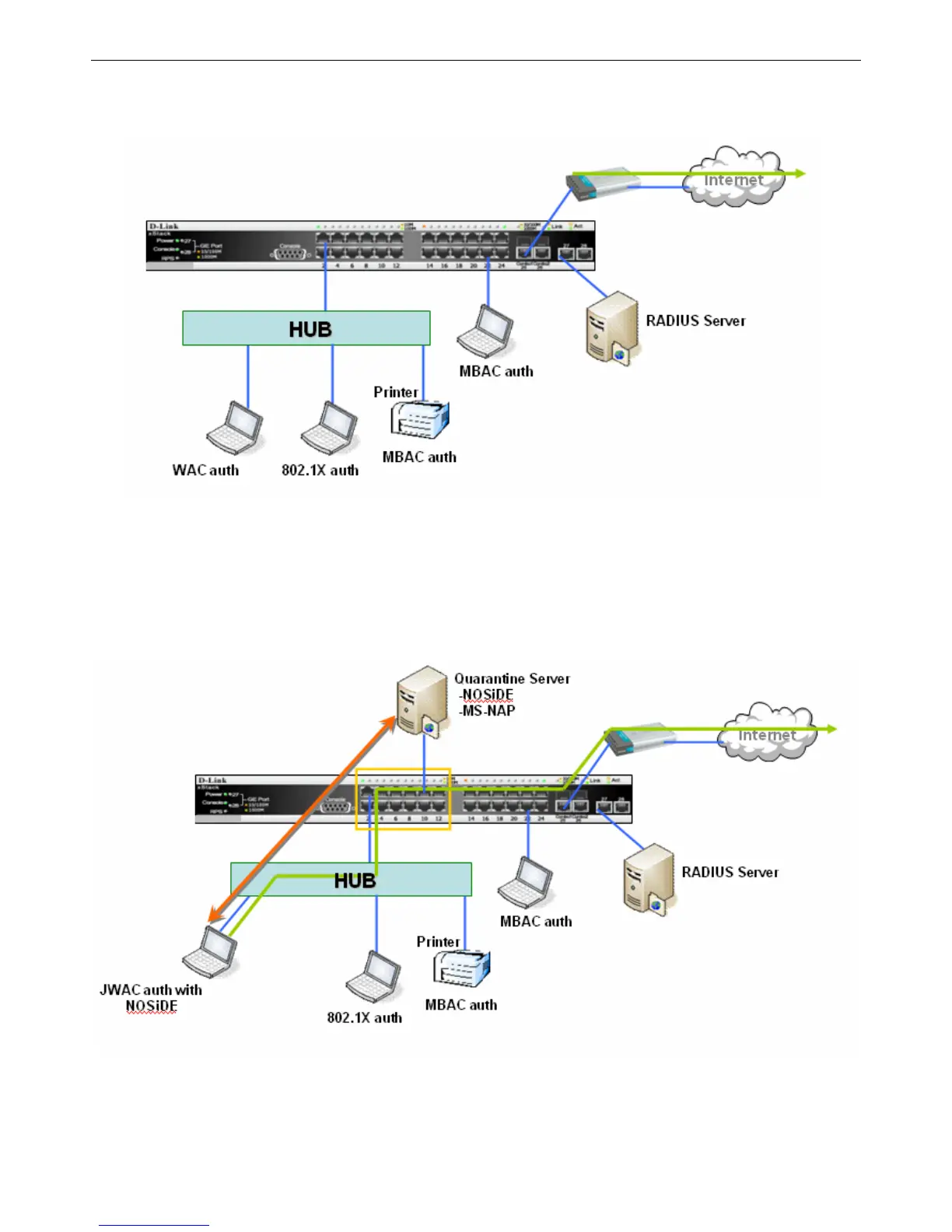 In the diagram above the Switch port has been configured to allow clients to authenticate using 802.1X, MBAC, or JWAC. When