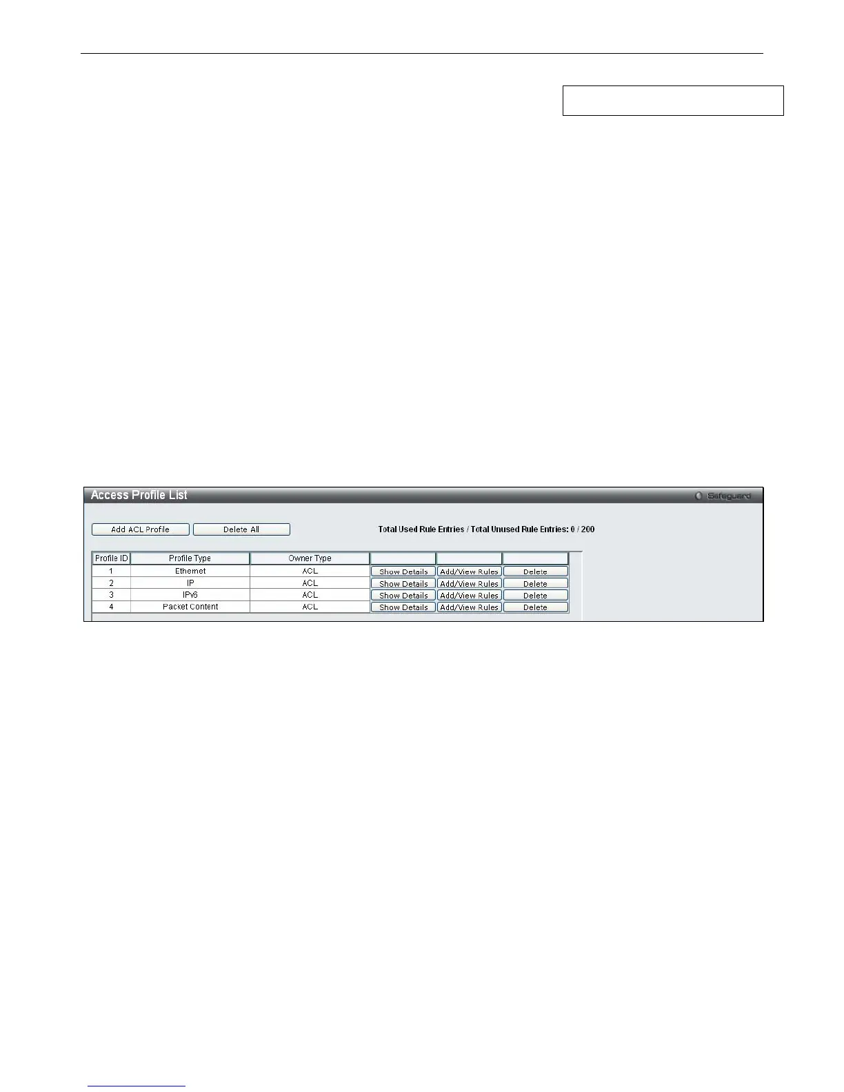 The Switch supports four Profile Types, Ethernet ACL, IPv4 ACL, IPv6 ACL, and Packet Content ACL.