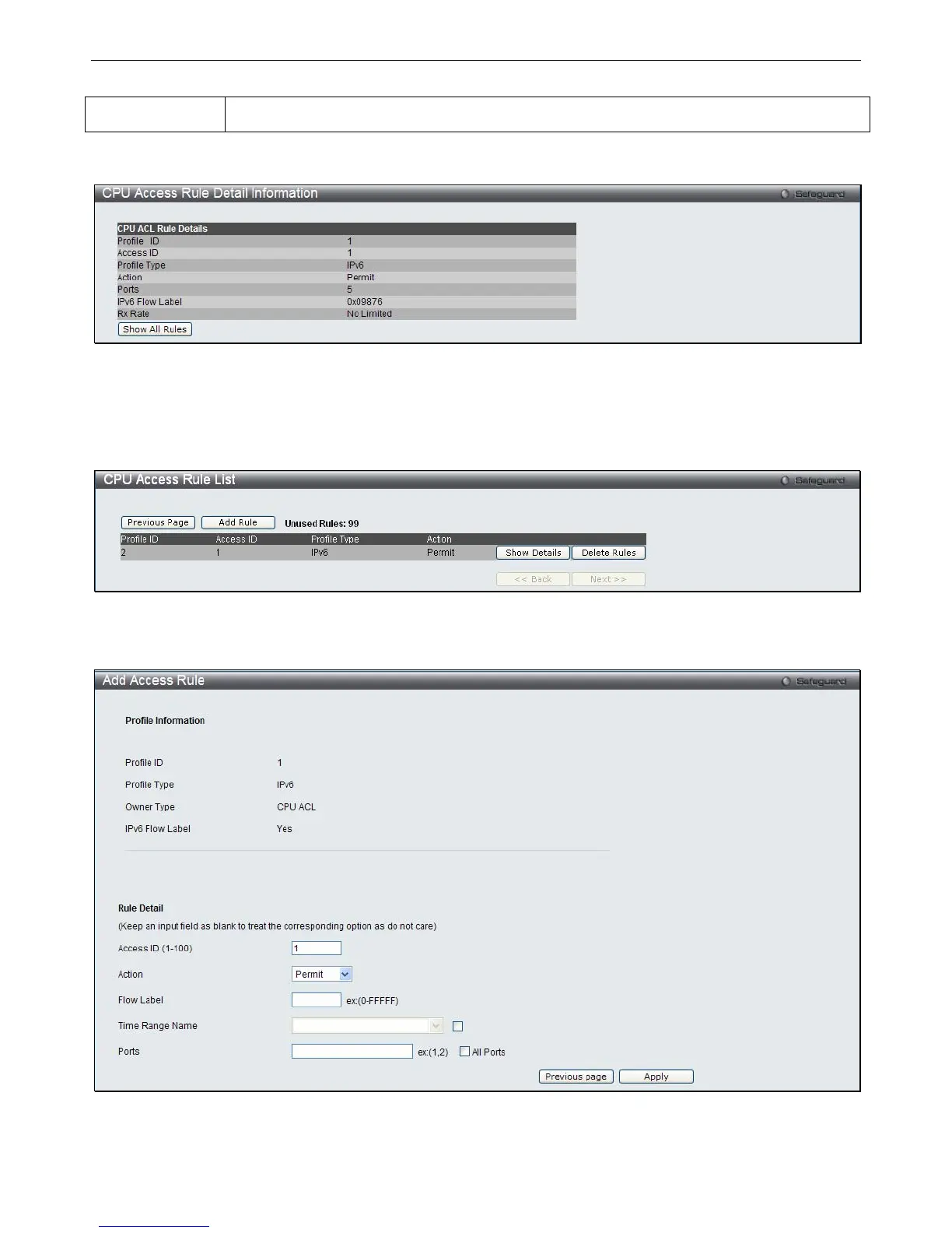To configure the Access Rules for IP, open the CPU Access Profile List window and click Add/View Rules for an IPv6 entry.