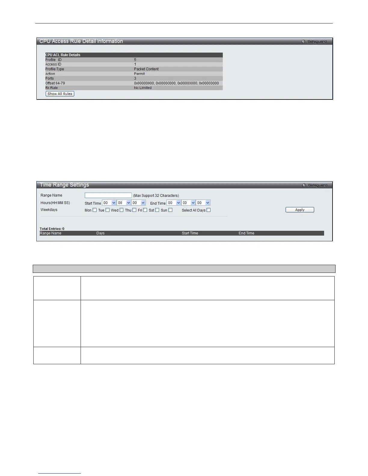 days of the week, when an Access Profile configuration will be enabled on the Switch. Once configured here, the time range