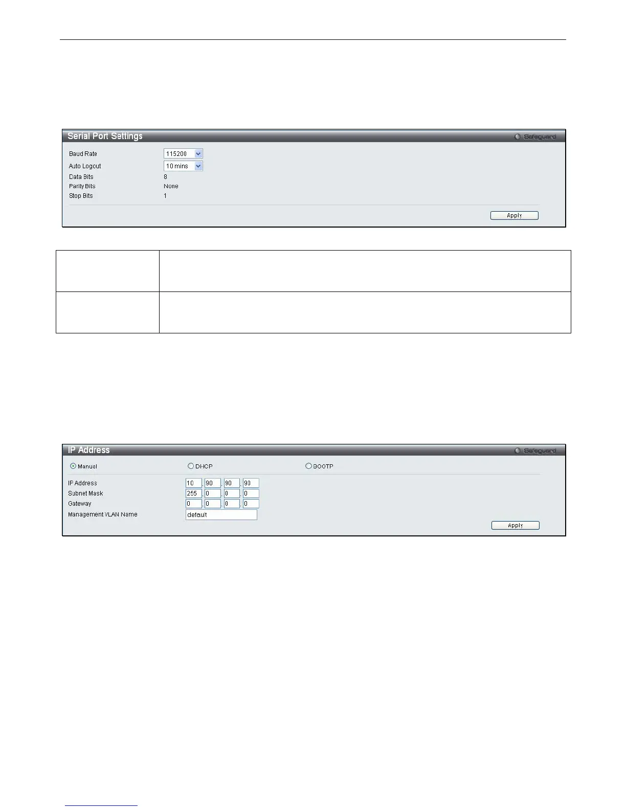 To manually assign the Switch’s IP address, subnet mask, and default gateway address: