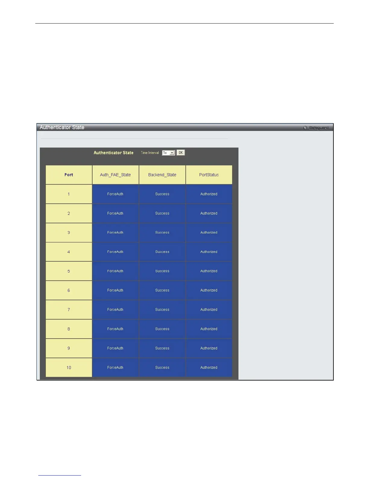 To view the following windows, click Monitoring > Port Access Control > Authenticator State:
