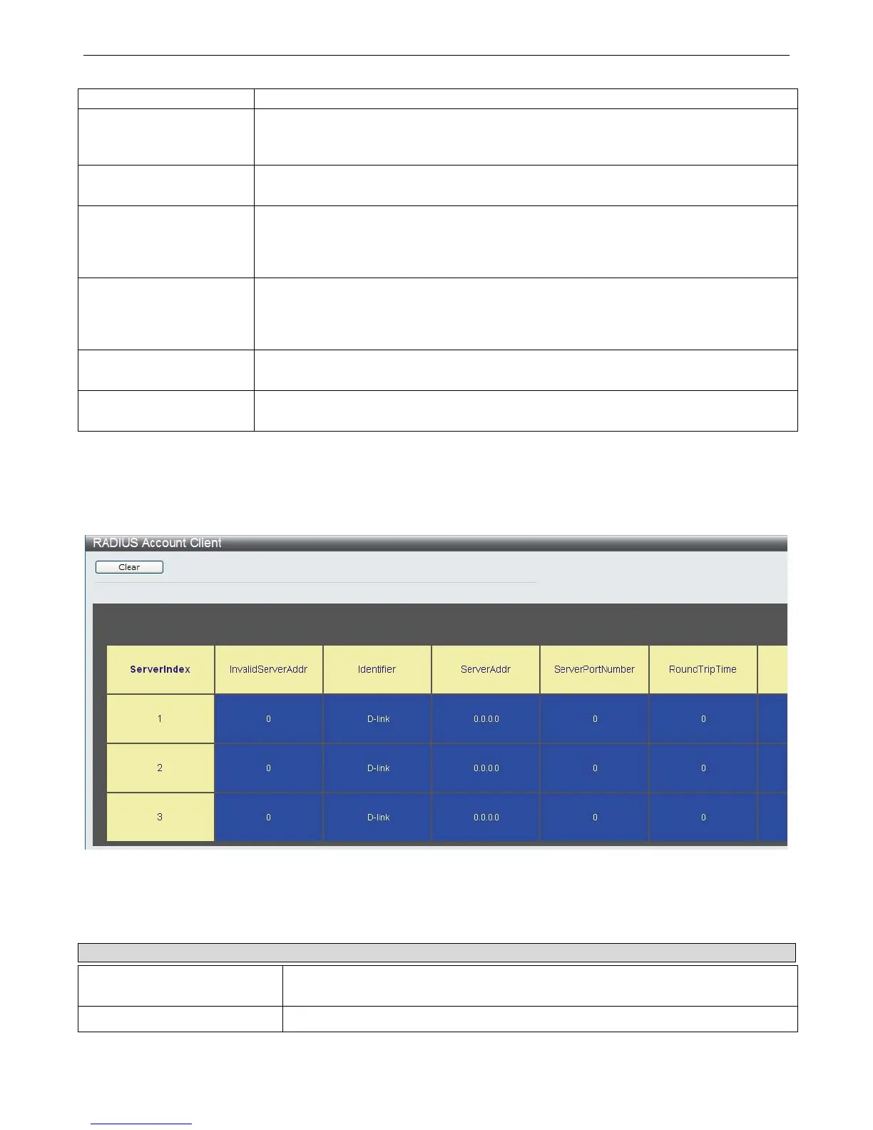 Users can display managed objects used for managing RADIUS accounting clients, and the current statistics associated with them.