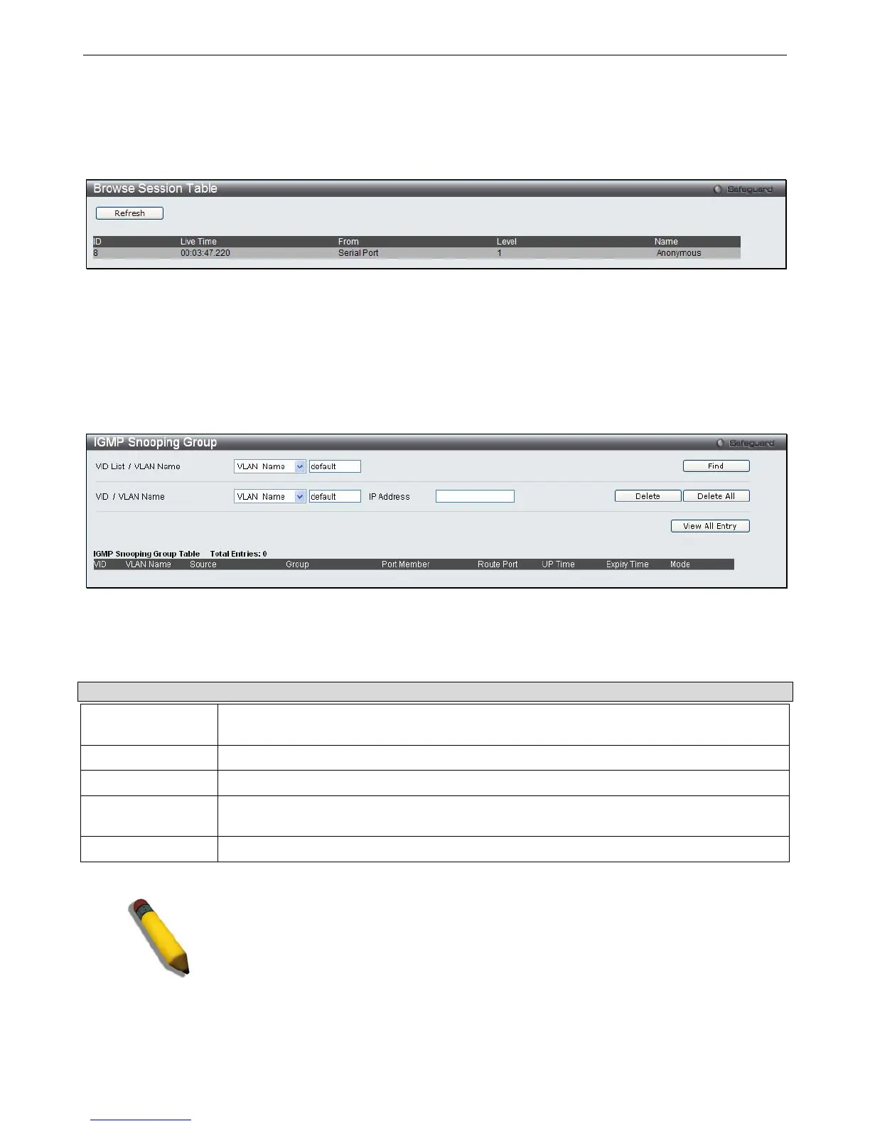 Users can view the Switch’s IGMP Snooping Group Table. IGMP Snooping allows the Switch to read the Multicast Group IP