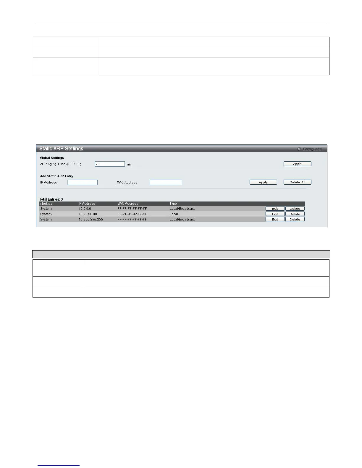 To delete a static ARP entry, click the Delete button located on the right side of the entry in the static ARP table at the bottom of